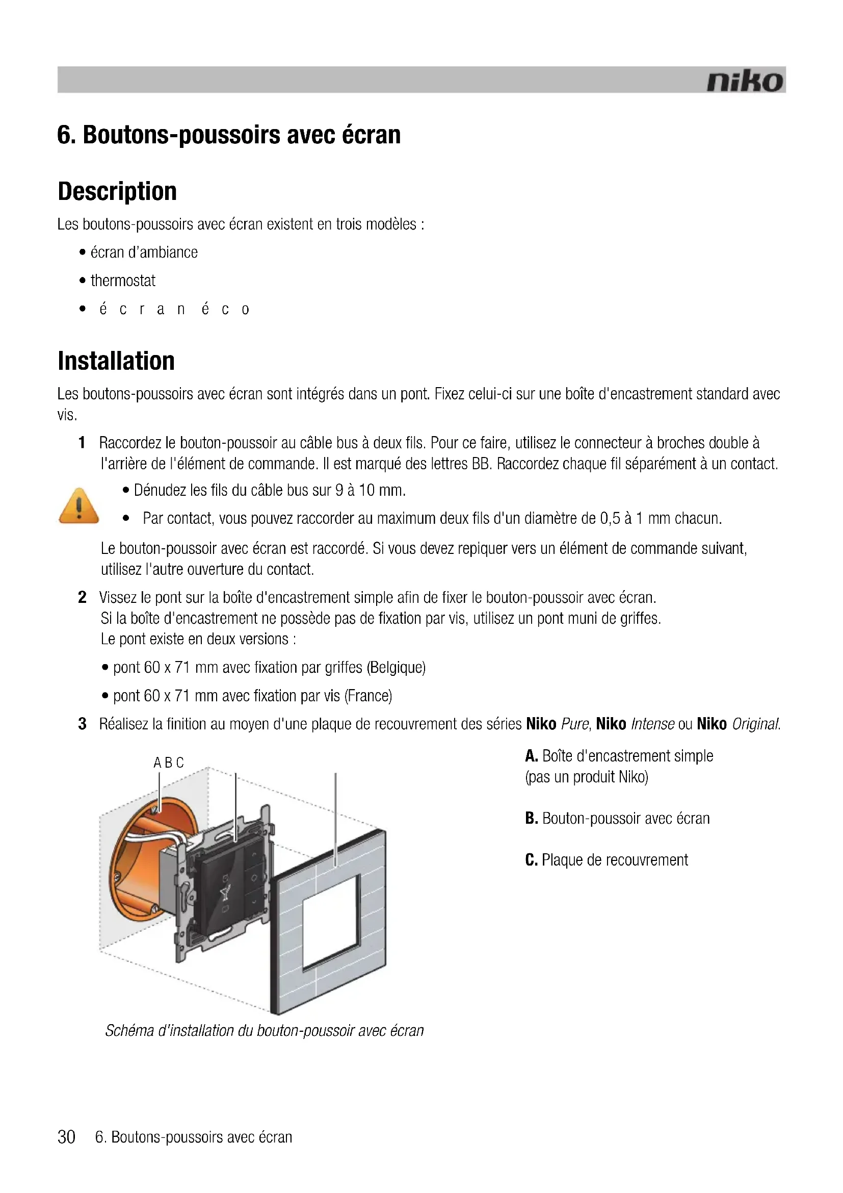 - Par contact, vous pouvez raccorder au maximum deux fils d'un diamètre de 0,5 à 1 mm chacun. Schéma d'installation du bouton-poussoir avec écran A. Boîte d'encastrement simple (pas un produit Niko) B. Bouton-poussoir avec écran C. Plaque de recouvrement A B C6. Boutons-poussoirs avec écran