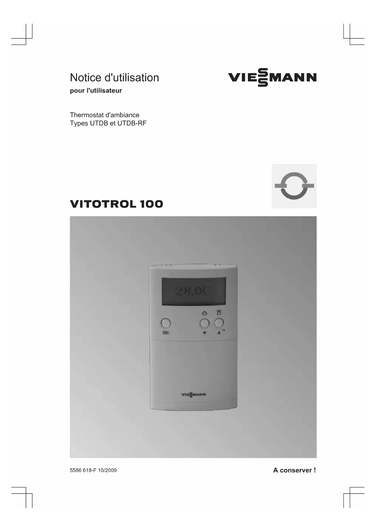 Notice d'utilisation pour l'utilisateur VIESMANN Thermostat d'ambiance Types UTDB et UTDB-RF VITOTROL 100 5586 618-F 10/2009 A conserver !2 Respecter scrupuleusement ces consignes de sécurité afin d'éviter tout risque et tout dommage pour les personnes et les biens. Explication des consignes de sécu- rité Danger Ce symbole met en garde contre les dommages pour les person- nes.