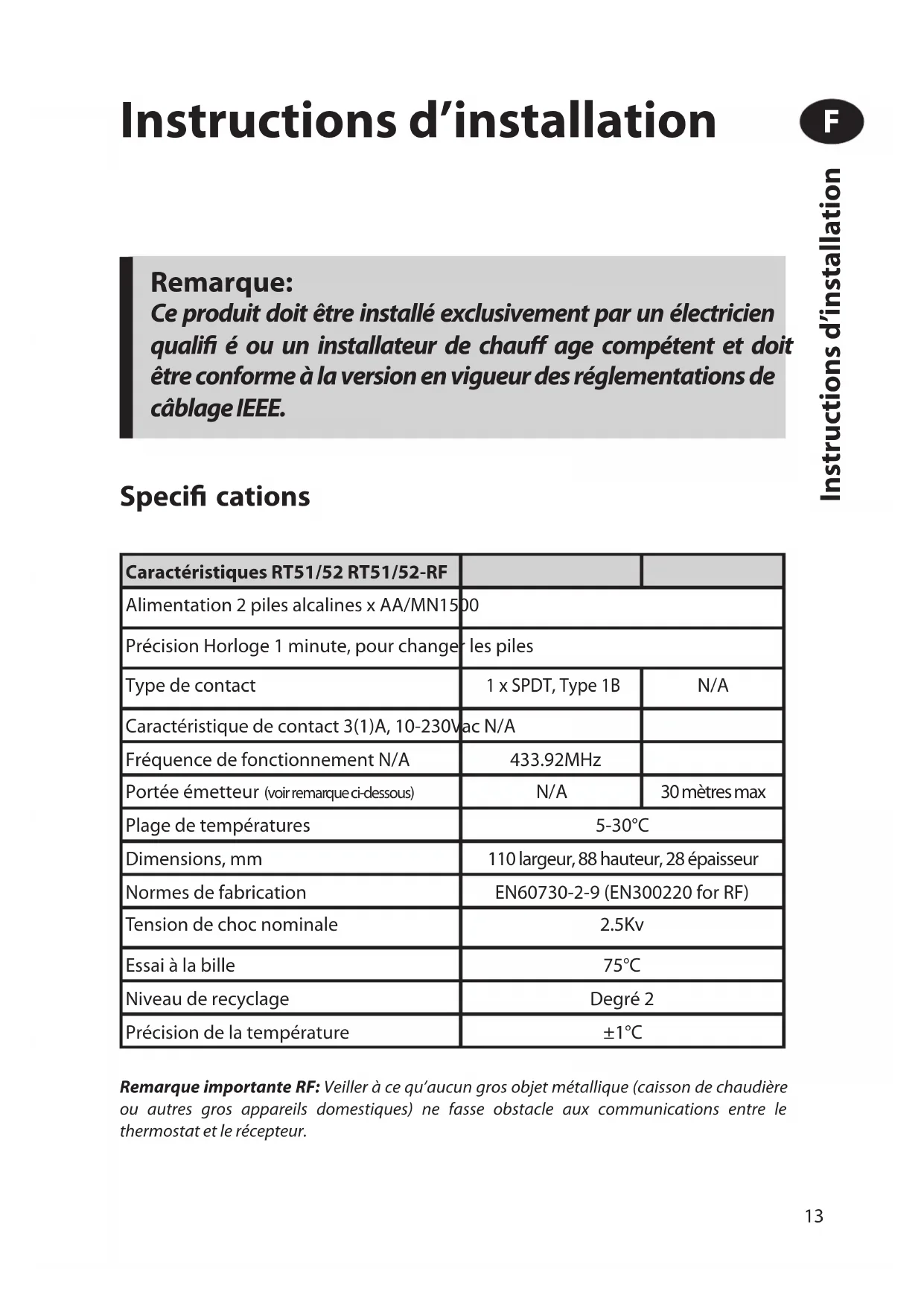NB. If the display ever goes blank during normal operation, the batteries will need to be renewed, the unit reset and the time and programmes reset. IMPORTANT: always use high quality alkaline batteries. User Instructions GB13 Instructions d’installation Remarque importante RF: Veiller à ce qu’aucun gros objet métallique (caisson de chaudière ou autres gros appareils domestiques) ne fasse obstacle aux communications entre le thermostat et le récepteur. Speci cations Remarque: Ce produit doit être installé exclusivement par un électricien quali é ou un installateur de chau age compétent et doit être conforme à la version en vigueur des réglementations de câblage IEEE. Caractéristiques RT51/52 RT51/52-RF Alimentation 2 piles alcalines x AA/MN1500 Précision Horloge 1 minute, pour changer les piles Type de contact 1 x SPDT, Type 1B N/A Caractéristique de contact 3(1)A, 10-230Vac N/A Fréquence de fonctionnement N/A 433.92MHz Portée émetteur (voir remarque ci-dessous) N/A 30 mètres max Plage de températures 5-30°C Dimensions, mm 110 largeur, 88 hauteur, 28 épaisseur Normes de fabrication EN60730-2-9 (EN300220 for RF) Tension de choc nominale 2.5Kv Essai à la bille 75°C Niveau de recyclage Degré 2 Précision de la température ±1°C Instructions d’installation F14 Installation Retirez tout d’abord la plaque murale de l’arrière de l’appareil. Par rapport au coin gauche supérieur de la plaque murale, vous devez disposer d’espacements d’au moins 140 mm à droite, 15 mm à gauche, 30 mm au-dessus et 100 mm en-dessous a n de pouvoir monter le module en chable. Instructions d’installation F15 Avant de monter l’appareil, ce dernier doit être en mode ON/ OFF (Marche/Arrêt) ou réglage chrono-proportionnel (voir ci- dessous).