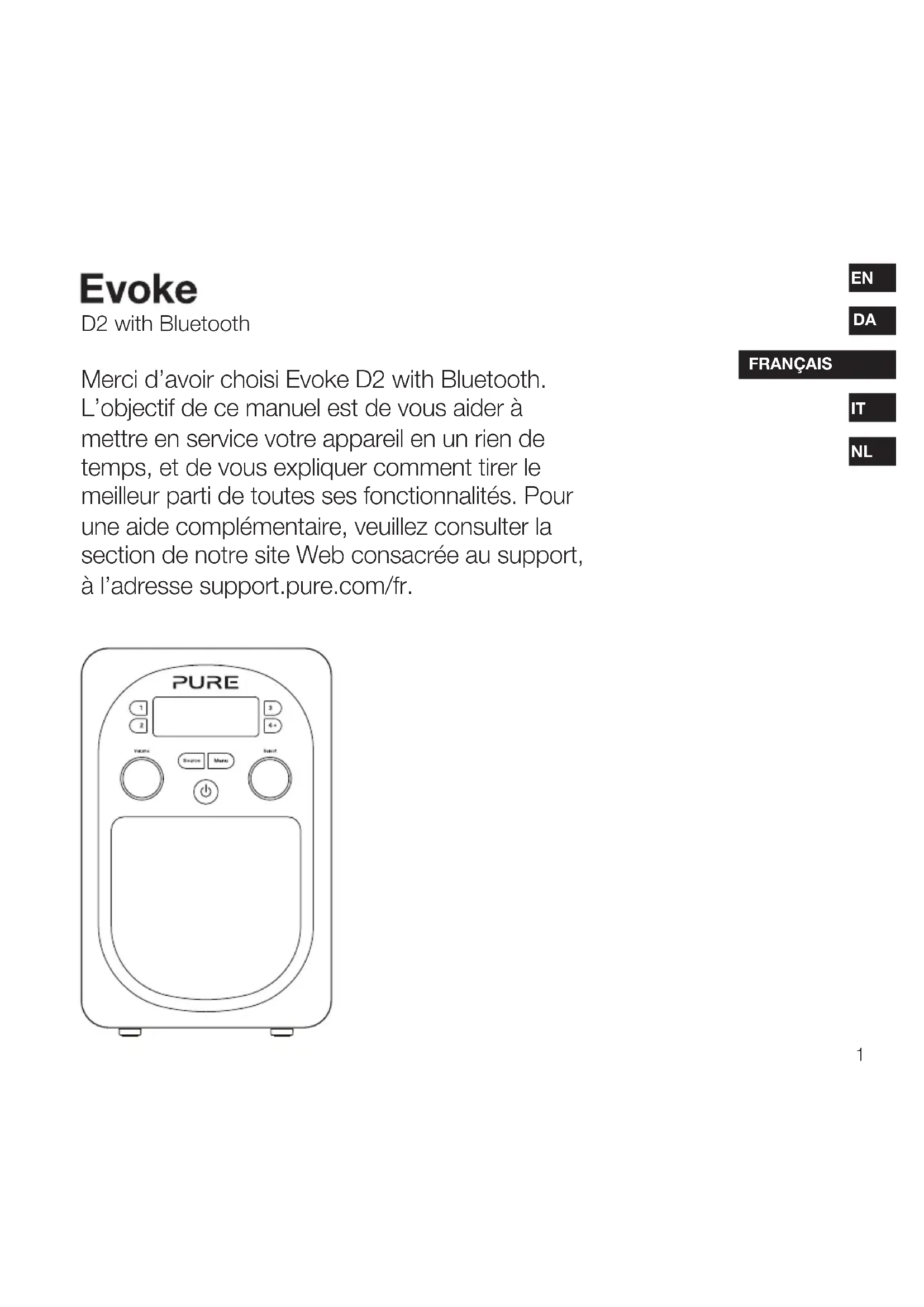 Merci d’avoir choisi Evoke D2 with Bluetooth. L’objectif de ce manuel est de vous aider à mettre en service votre appareil en un rien de temps, et de vous expliquer comment tirer le meilleur parti de toutes ses fonctionnalités. Pour une aide complémentaire, veuillez consulter la section de notre site Web consacrée au support, à l’adresse support.pure.com/fr. D2 with Bluetooth DA2 Informations de sécurité