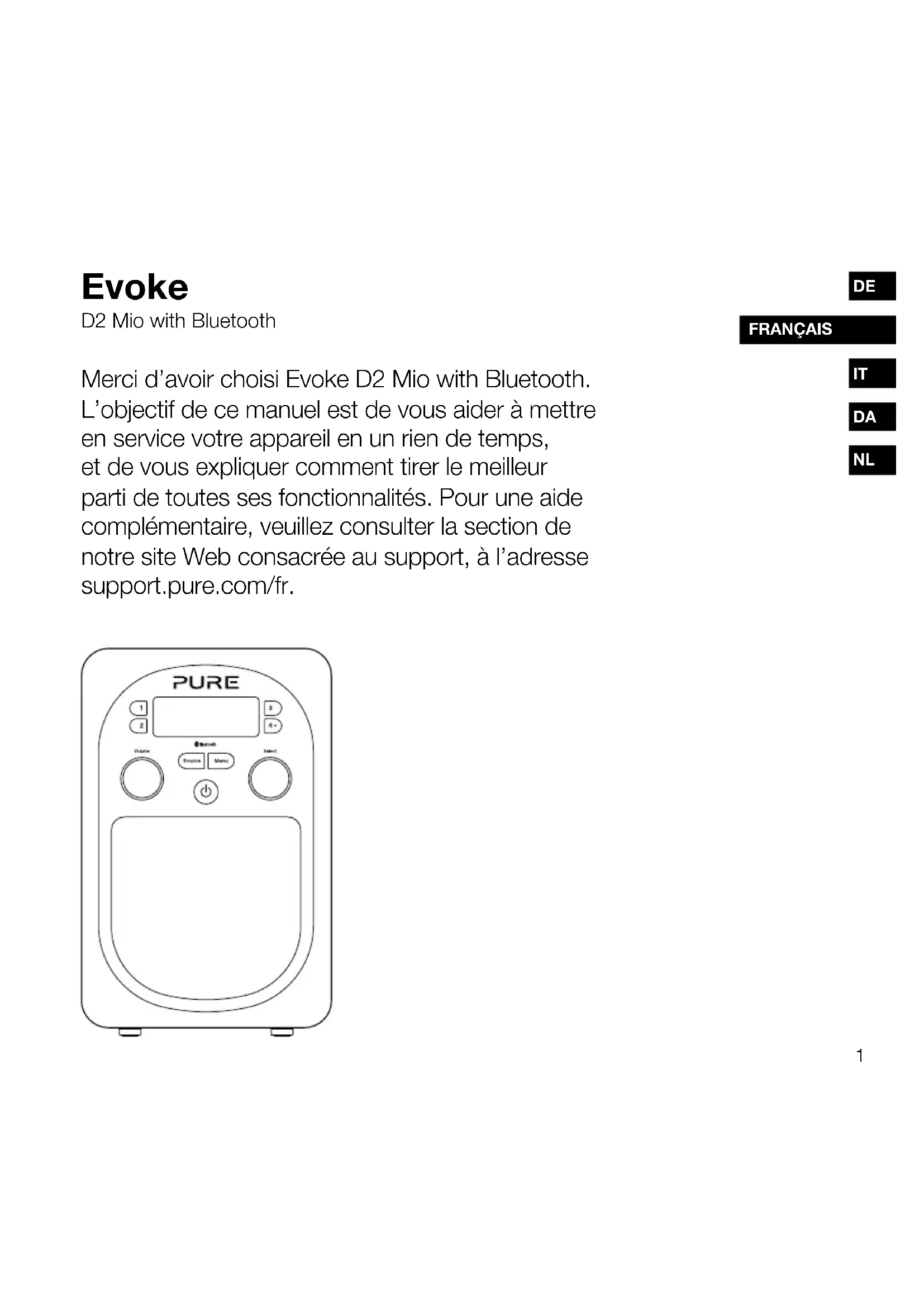 Merci d’avoir choisi Evoke D2 Mio with Bluetooth. L’objectif de ce manuel est de vous aider à mettre en service votre appareil en un rien de temps, et de vous expliquer comment tirer le meilleur parti de toutes ses fonctionnalités. Pour une aide complémentaire, veuillez consulter la section de notre site Web consacrée au support, à l’adresse support.pure.com/fr. D2 Mio with Bluetooth Evoke Evoke_D2_Bluetooth_Mio-Euro.indb 1 6/11/2014 12:10:48 PM2 Informations de sécurité