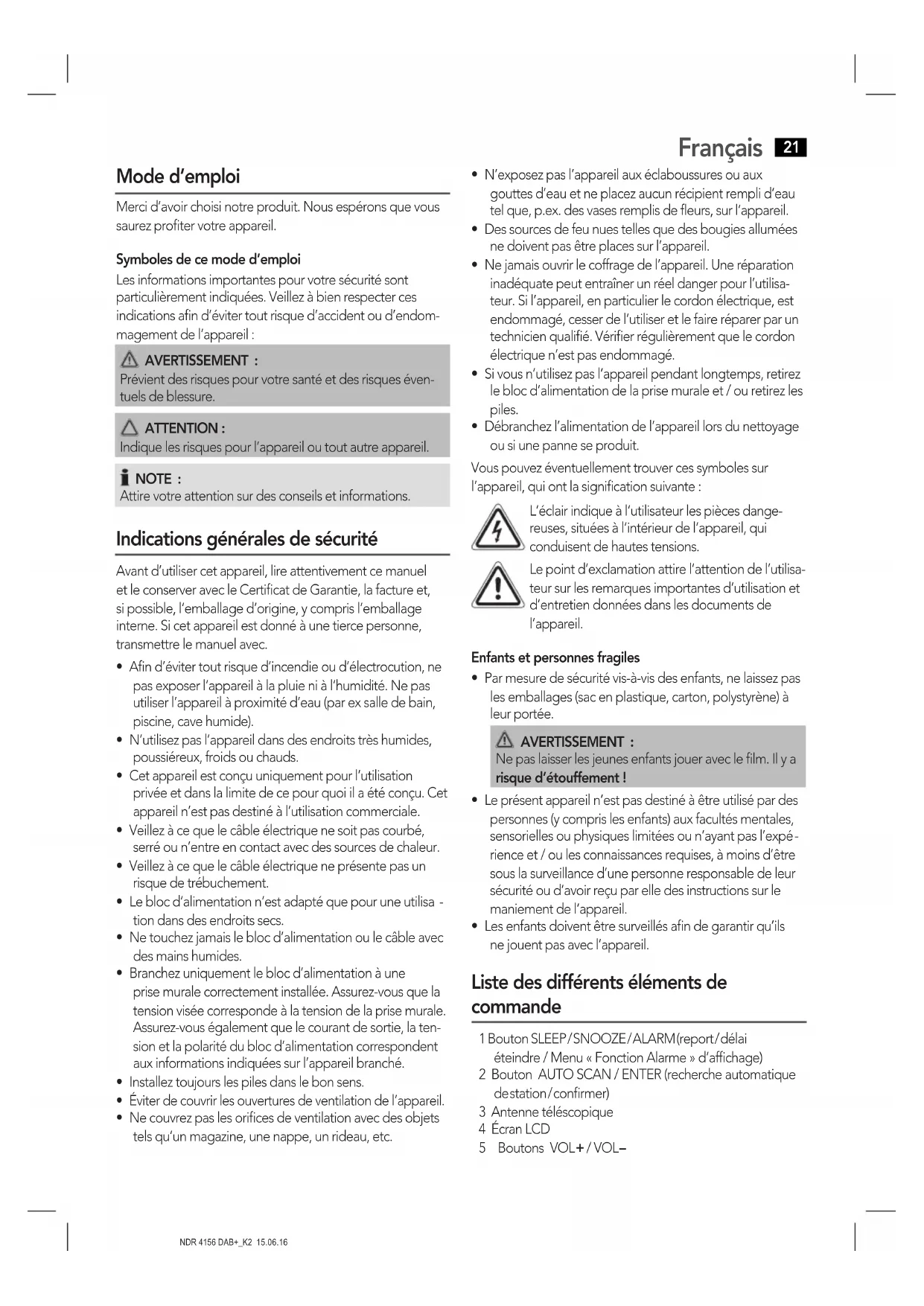 - Les enfants doivent être surveillés afin de garantir qu’ils ne jouent pas avec l’appareil. Liste des différents éléments de commande 1 Bouton SLEEP / SNOOZE / ALARM (report / délai éteindre / Menu « Fonction Alarme » d’affichage) 2 Bouton AUTO SCAN / ENTER (recherche automatique de station / confirmer) 3 Antenne téléscopique 4 Écran LCD 5 Boutons VOL + / VOL –22 Français