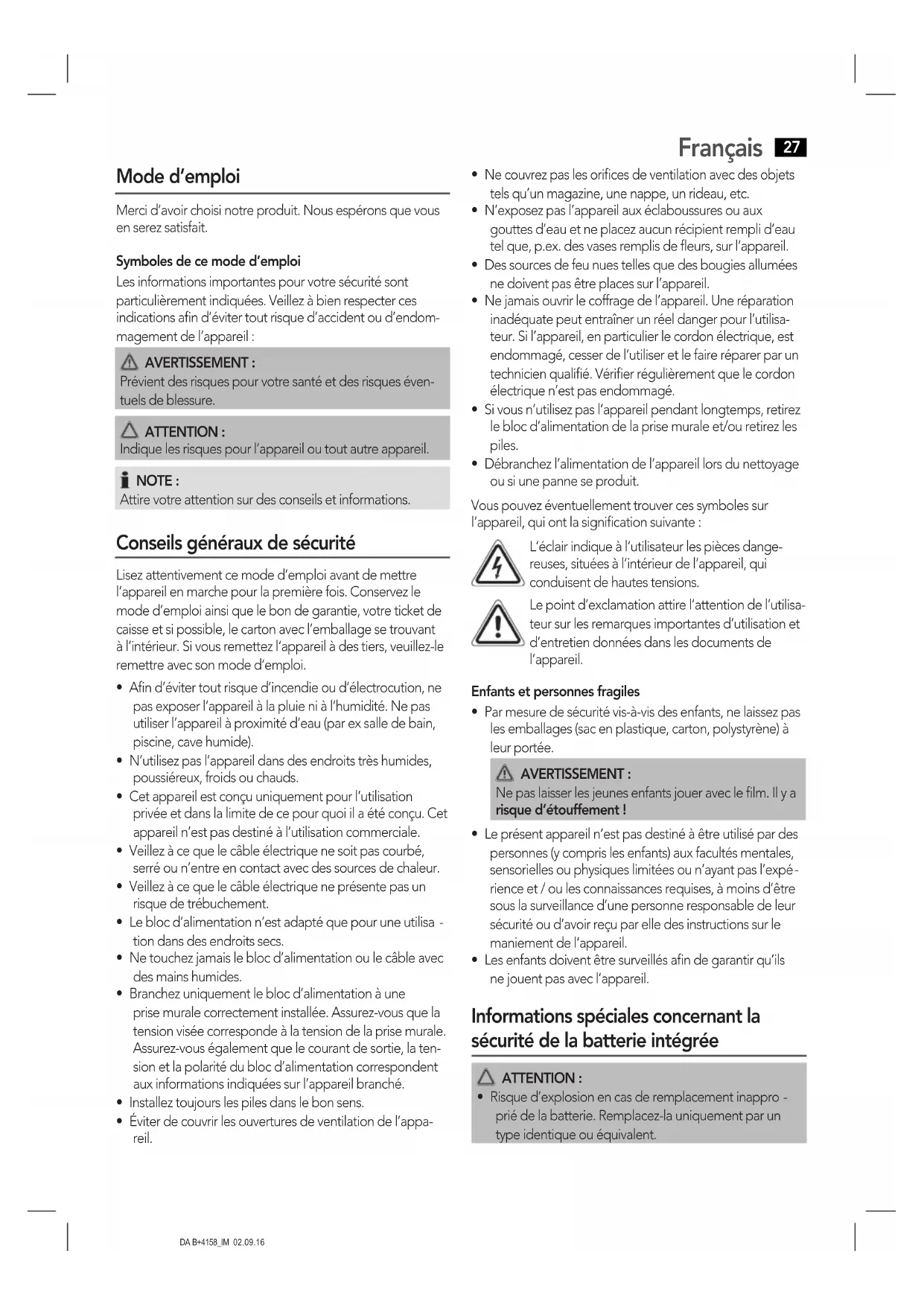 prié de la batterie. Remplacez-la uniquement par un type identique ou équivalent.28 Français DA B+4158_IM 02.09.16 ATTENTION :