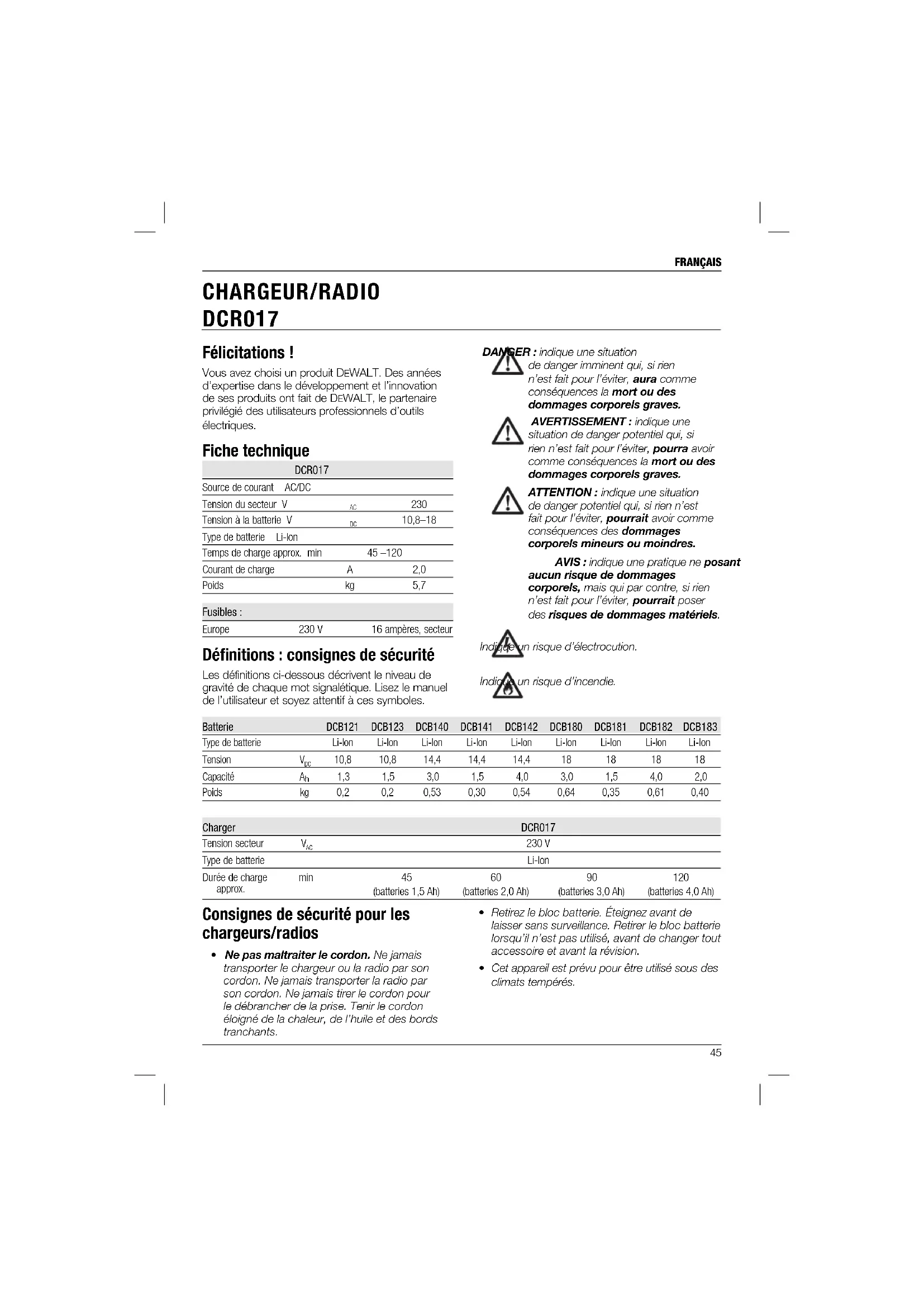 10,8–18 Type de batterie Li-Ion Temps de charge approx. min 45 –120 Courant de charge A 2,0 Poids kg 5,7 Fusibles: Europe 230 V 16 ampères, secteur Défi nitions : consignes de sécurité Les définitions ci-dessous décrivent le niveau de gravité de chaque mot signalétique. Lisez le manuel de l’utilisateur et soyez attentif à ces symboles. CHARGEUR/RADIO DCR017 Batterie DCB121 DCB123 DCB140 DCB141 DCB142 DCB180 DCB181 DCB182 DCB183 Type de batterie Li-Ion Li-Ion Li-Ion Li-Ion Li-Ion Li-Ion Li-Ion Li-Ion Li-Ion Tension V
