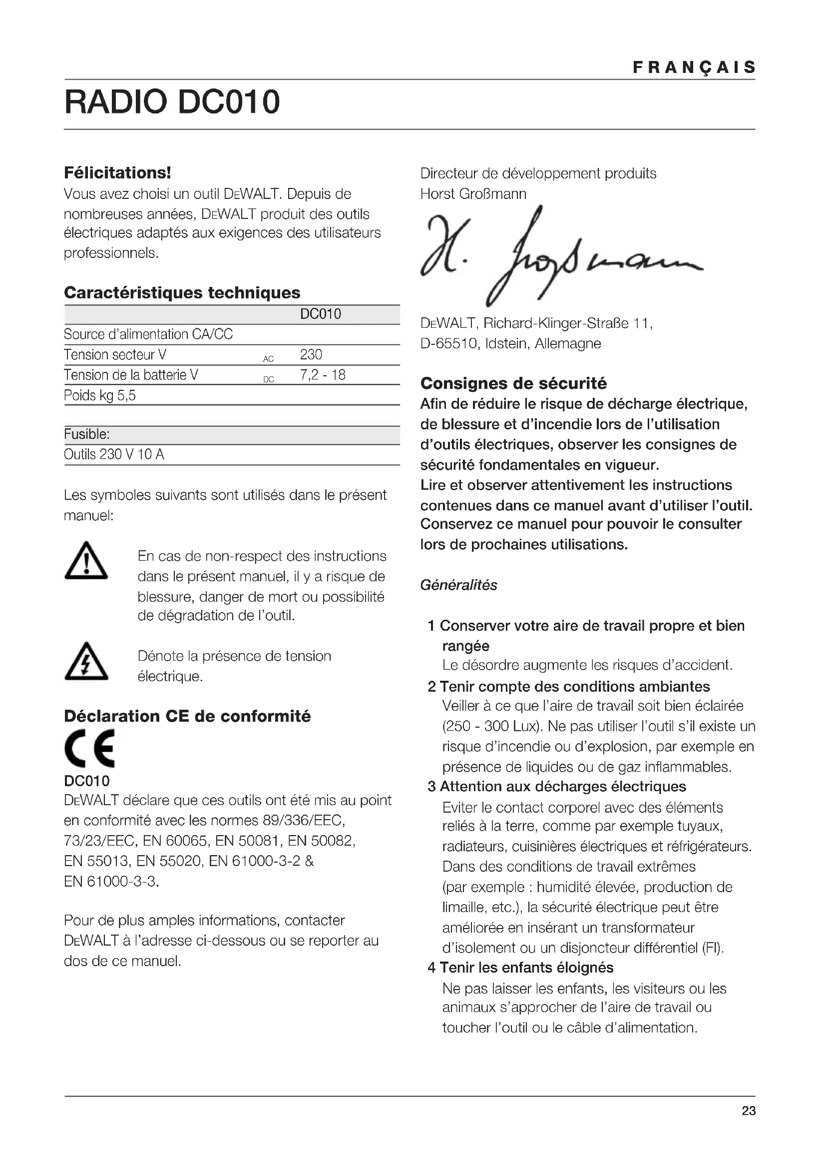 7,2 - 18 Poids kg 5,5 Fusible: Outils 230 V 10 A Les symboles suivants sont utilisés dans le présent manuel: En cas de non-respect des instructions dans le présent manuel, il y a risque de blessure, danger de mort ou possibilité de dégradation de l’outil. Dénote la présence de tension électrique. Déclaration CE de conformité DC010 DEWALT déclare que ces outils ont été mis au point en conformité avec les normes 89/336/EEC, 73/23/EEC, EN 60065, EN 50081, EN 50082, EN 55013, EN 55020, EN 61000-3-2 & EN 61000-3-3. Pour de plus amples informations, contacter DEWALT à l’adresse ci-dessous ou se reporter au dos de ce manuel. Directeur de développement produits Horst Großmann DEWALT, Richard-Klinger-Straße 11, D-65510, Idstein, Allemagne Consignes de sécurité Afin de réduire le risque de décharge électrique, de blessure et d’incendie lors de l’utilisation d’outils électriques, observer les consignes de sécurité fondamentales en vigueur. Lire et observer attentivement les instructions contenues dans ce manuel avant d’utiliser l’outil. Conservez ce manuel pour pouvoir le consulter lors de prochaines utilisations. Généralités 1 Conserver votre aire de travail propre et bien rangée Le désordre augmente les risques d’accident. 2 Tenir compte des conditions ambiantes Veiller à ce que l’aire de travail soit bien éclairée (250 - 300 Lux). Ne pas utiliser l’outil s’il existe un risque d’incendie ou d’explosion, par exemple en présence de liquides ou de gaz inflammables. 3 Attention aux décharges électriques Eviter le contact corporel avec des éléments reliés à la terre, comme par exemple tuyaux, radiateurs, cuisinières électriques et réfrigérateurs. Dans des conditions de travail extrêmes (par exemple : humidité élevée, production de limaille, etc.), la sécurité électrique peut être améliorée en insérant un transformateur d’isolement ou un disjoncteur différentiel (FI). 4 Tenir les enfants éloignés Ne pas laisser les enfants, les visiteurs ou les animaux s’approcher de l’aire de travail ou toucher l’outil ou le câble d’alimentation.24 FRANÇAIS 5 Utiliser l’outil adéquat Le domaine d’utilisation de l’outil est décrit dans le présent manuel. Ne pas utiliser des outils ou des accessoires de trop petite taille pour exécuter des travaux lourds. Ne pas utiliser des outils à des fins et pour des travaux pour lesquels ils n’ont pas été conçus. Ne pas forcer sur l’outil. Attention ! L’utilisation d’accessoires ou la réalisation de travaux autres que ceux recommandés dans ce manuel pourrait entraîner un risque de blessure corporelle. 6 Contrôler si l’outil est endommagé Avant d’utiliser l’outil, vérifier qu’il n’est pas endommagé. Contrôler l’alignement des pièces en mouvement et leur grippage éventuel. Tous les composants doivent être montés correctement et remplir les conditions pour garantir le fonctionnement impeccable de l’outil. Faire réparer ou échanger tout dispositif de sécurité et toute pièce endommagée conformément aux instructions. Ne pas utiliser l’outil quand l’interrupteur est défectueux. Faire remplacer l’interrupteur par un Service agréé DEWALT. 7 Ranger vos outils dans un endroit sûr Ranger les outils non utilisés dans un endroit sec, fermé à clé et hors de portée des enfants. 8 Entretenir vos outils avec soin Garder les outils en bon état et propres afin d’assurer des conditions de travail optimales et sûres. Observer les instructions d’entretien et de changement d’accessoires. Maintenir les poignées et les interrupteurs secs, propres et exempts d’huile et de graisse. 9 Réparations Cet outil est conforme aux consignes de sécurité en vigueur. Faire réparer l’outil par un agent de réparation DEWALT agréé. Les réparations ne devront être effectuées que par des personnes qualifiées utilisant des pièces de rechange d’origine. Dans le cas contraire, cela pourrait être très dangereux pour l’utilisateur. Consignes de sécurité pour les outils électriques 10 Rallonges Vérifier la rallonge avant de l’utiliser et la remplacer si elle est endommagée. Pour utiliser cet outil à l’extérieur, n’utiliser que des rallonges prévues à cet effet et portant une inscription adéquate. 11 Pour débrancher l’outil Éteindre l’outil puis attendre qu’il s’arrête complètement avant de le laisser sans surveillance. Débrancher l’outil lorsqu’il n’est pas utilisé, avant de changer toute pièce ou tout accessoire et avant de procéder à l’entretien. 12 Préserver le câble d’alimentation Ne transportez jamais l’outil par le câble. Ne tirez jamais sur le câble pour le débrancher. Préservez le câble de la chaleur, de l’huile et des arêtes vives. Consignes de sécurité pour les outils alimentés par batterie 13 Retirer le pack-batteries Éteindre l’outil puis attendre qu’il s’arrête complètement avant de le laisser sans surveillance. Retirer le pack-batteries lorsqu’il n’est pas utilisé, avant de changer toute pièce ou tout accessoire et avant de procéder à l’entretien. Contenu de l’emballage L’emballage contient: 1 Radio 1 Manuel d’instructions 1 Dessin éclaté