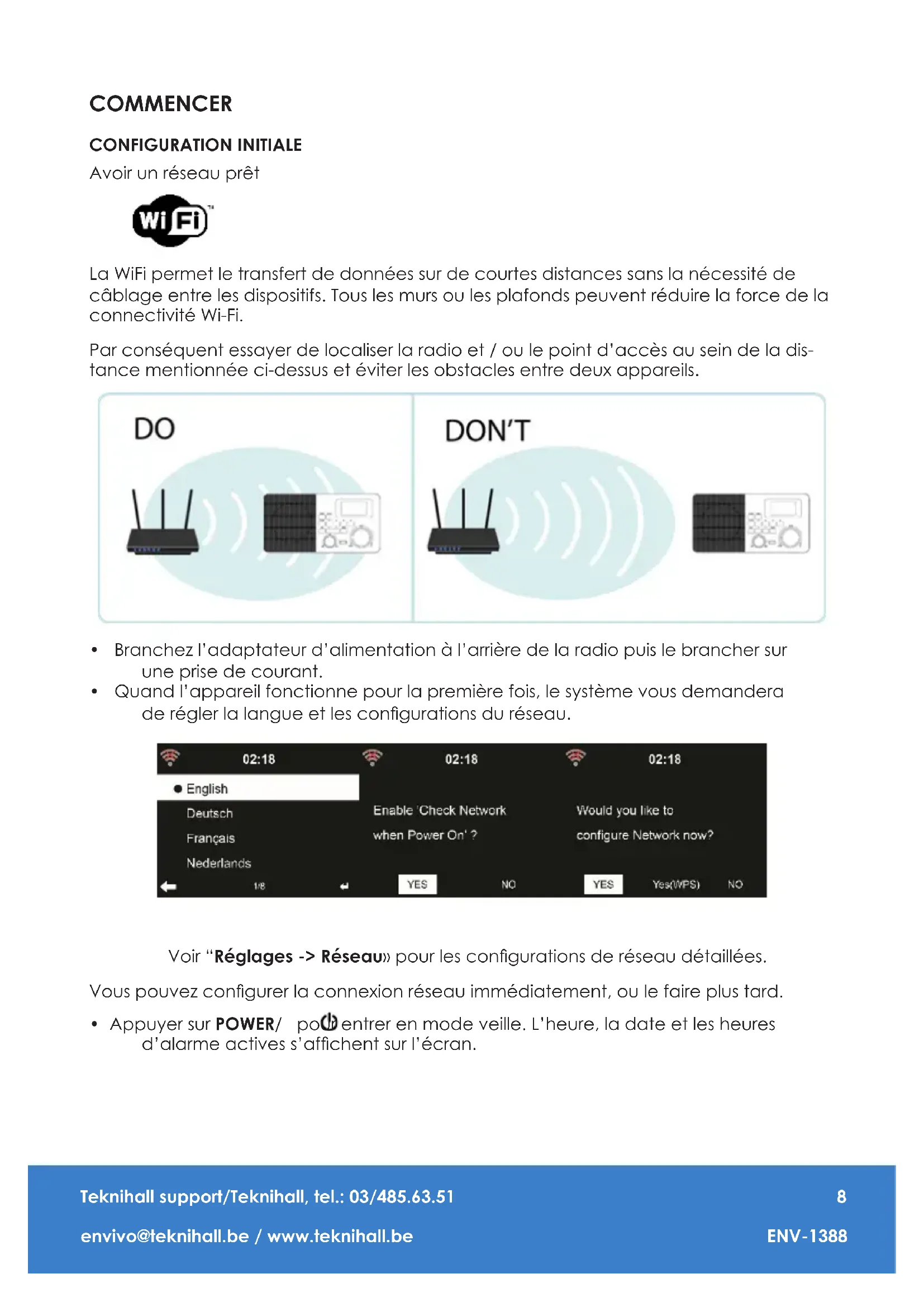 - Vérier le Réseau quand l’appareil est en marche Activer / désactiver le réseau WiFi. Lorsque vous allumez la radio, il se connectera automatiquement au dernier réseau WiFi si Vérier le réseau quand l’appareil est en marche est activé. Remarque: Si la connexion réseau sans l n’existe pas ou a échoué, l’icône dans le coinTeknihall support/Teknihall, tel.: 03/485.63.51 envivo@teknihall.be / www.teknihall.be ENV-1388