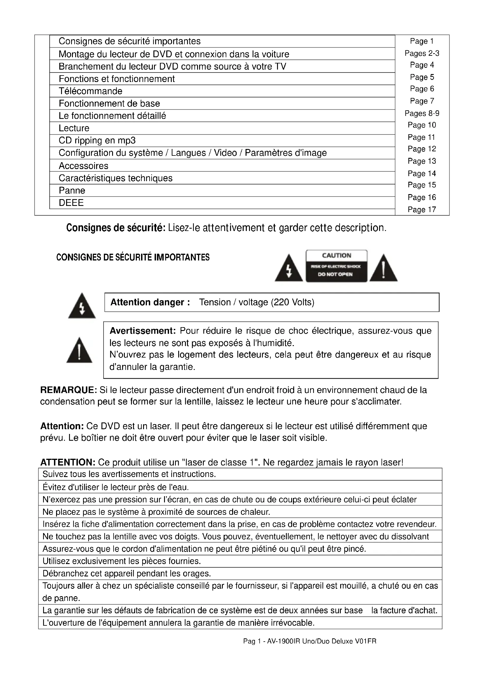Avant toute utilisation, lire attentivement ces instructions. V01 AVG$Pag 1 - AV-1900IR Uno/Duo Deluxe V01FR Consignes de sécurité importantes Montage du lecteur de DVD et connexion dans la voiture Branchement du lecteur DVD comme source à votre TV Fonctions et fonctionnement Télécommande Fonctionnement de base Le fonctionnement détaillé Lecture CD ripping en mp3 Configuration du système / Langues / Video / Paramètres d'image Accessoires Caractéristiques techniques Panne DEEE Page 1 Pages 2-3 Page 4 Page 5 Page 6 Page 7 Pages 8-9 Page 10 Page 11 Page 12 Page 13 Page 14 Page 15 Page 16 Page 17 Consignes de sécurité: Lisez-le attentivement et garder cette description.