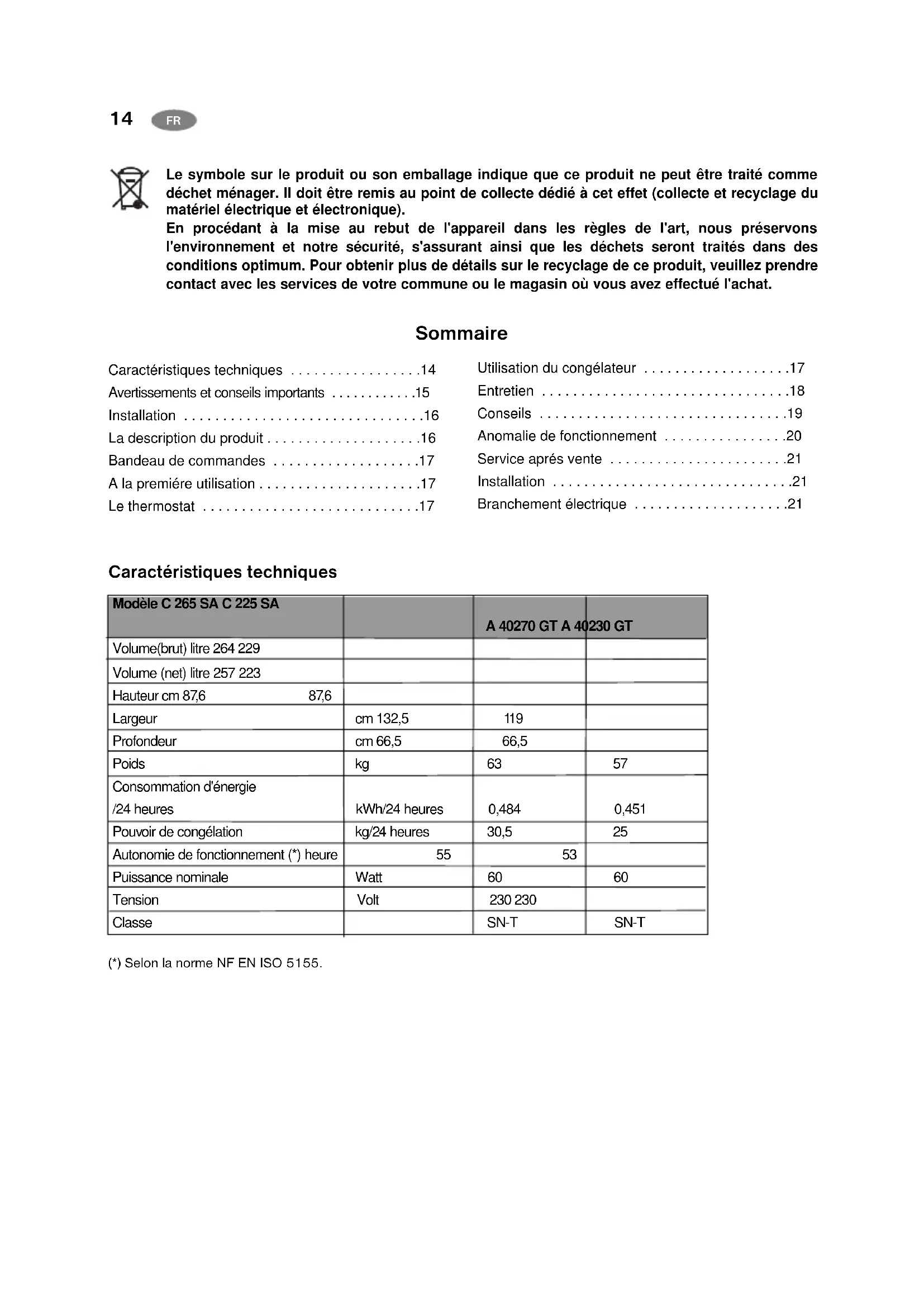 - Branchement électrique Modèle C 265 SA C 225 SA A 40270 GT A 40230 GT Volume(brut) litre 264 229 Volume (net) litre 257 223 Hauteur cm 87,6 87,6 Largeur cm 132,5 119 Profondeur cm 66,5 66,5 Poids kg 63 57 Consommation d'énergie /24 heures kWh/24 heures 0,484 0,451 Pouvoir de congélation kg/24 heures 30,5 25 Autonomie de fonctionnement (*) heure 55 53 Puissance nominale Watt 60 60 Tension Volt 230 230 Classe SN-T SN-T Caractéristiques techniques (*) Selon la norme NF EN ISO 5155.15 p. 21
