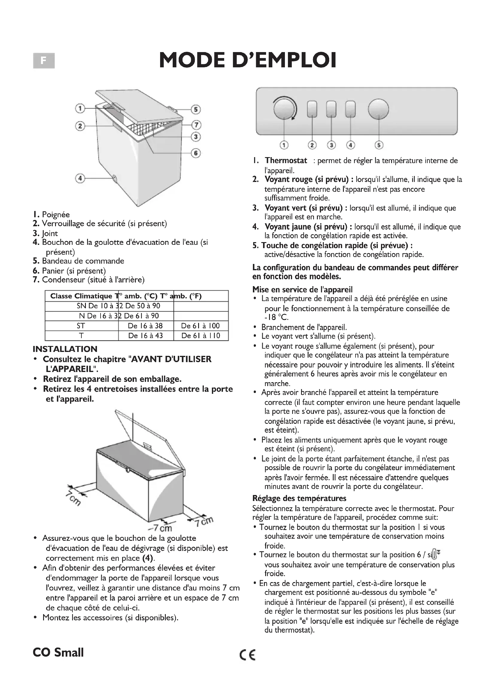 - En cas de chargement partiel, c'est-à-dire lorsque le chargement est positionné au-dessous du symbole "e" indiqué à l'intérieur de l'appareil (si présent), il est conseillé de régler le thermostat sur les positions les plus basses (sur la position "e" lorsqu'elle est indiquée sur l'échelle de réglage du thermostat). Classe Climatique T° amb. (°C) T° amb. (°F) SN De 10 à 32 De 50 à 90 N De 16 à 32 De 61 à 90 ST De 16 à 38 De 61 à 100 T De 16 à 43 De 61 à 110 CO SmallMODE D’EMPLOI