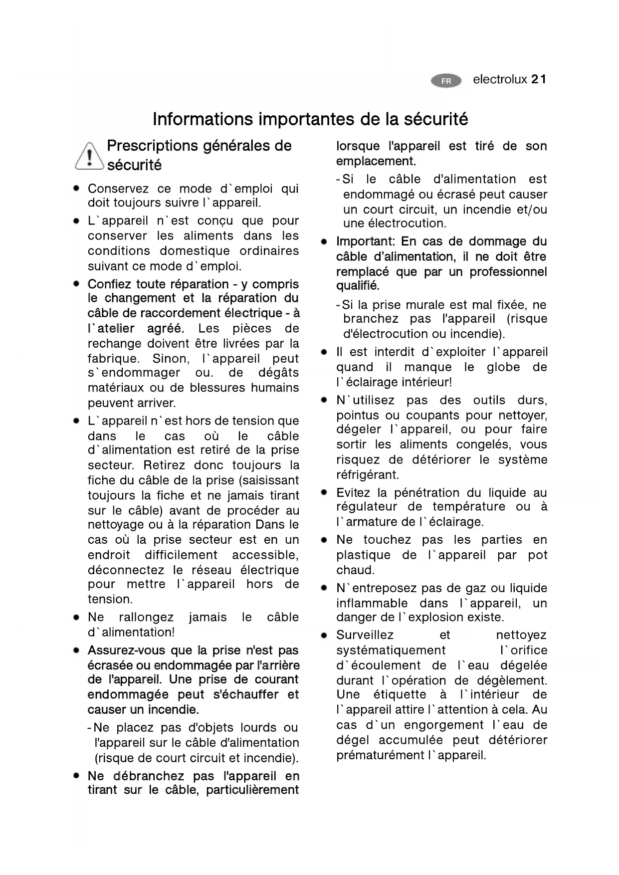 IInnffoorrmmaattiioonnss iimmppoorrttaanntteess ddee llaa ssééccuurriittéé PPrreessccrriippttiioonnss ggéénnéérraalleess ddee ssééccuurriittéé Conservez ce mode d`emploi qui doit toujours suivre l`appareil. L`appareil n`est conçu que pour conserver les aliments dans les conditions domestique ordinaires suivant ce mode d`emploi. CCoonnffiieezz ttoouuttee rrééppaarraattiioonn -- yy ccoommpprriiss llee cchhaannggeemmeenntt eett llaa rrééppaarraattiioonn dduu ccââbbllee ddee rraaccccoorrddeemmeenntt éélle eccttrriiqquuee -- àà ll``aatteelliieerr aaggrréééé.. Les pièces de rechange doivent être livrées par la fabrique. Sinon, l`appareil peut s`endommager ou. de dégâts matériaux ou de blessures humains peuvent arriver. L`appareil n`est hors de tension que dans le cas où le câble d`alimentation est retiré de la prise secteur. Retirez donc toujours la fiche du câble de la prise (saisissant toujours la fiche et ne jamais tirant sur le câble) avant de procéder au nettoyage ou à la réparation Dans le cas où la prise secteur est en un endroit difficilement accessible, déconnectez le réseau électrique pour mettre l`appareil hors de tension. Ne rallongez jamais le câble d`alimentation! AAssssuurreezz--vvoouuss qquuee llaa pprriissee nn''eesstt ppaass ééccrraassééee oouu eennddoommmmaaggééee ppaarr ll''a arrrriièèrree ddee ll''aappppaarreeiill.. UUnnee pprriissee ddee ccoouurraanntt eennddoommmmaaggééee ppeeuutt ss''éécchhaauuffffeerr eett ccaauusseerr uunn iinncceennddiiee.. - Ne placez pas d'objets lourds ou l'appareil sur le câble d'alimentation (risque de court circuit et incendie). NNee d déébbrraanncchheezz ppaass ll''aappppaarreeiill eenn ttiirraanntt ssuurr llee ccââbbllee,, ppaarrttiiccuulliièèrreemmeenntt lloorrssqquuee ll''aappppaarreeiill eesstt ttiirréé ddee ssoonn eemmppllaacceemmeenntt.. - Si le câble d'alimentation est endommagé ou écrasé peut causer un court circuit, un incendie et/ou une électrocution. IImmppoorrttaanntt:: EEnn ccaass ddee ddoommmmaaggee dduu ccââbbllee dd’’aalliimmeennttaatti ioonn,, iill nnee ddooiitt êêttrree rreemmppllaaccéé qquuee ppaarr uunn pprrooffeessssiioonnnneell qquuaalliiffiiéé.. - Si la prise murale est mal fixée, ne branchez pas l'appareil (risque d'électrocution ou incendie). Il est interdit d`exploiter l`appareil quand il manque le globe de l`éclairage intérieur! N`utilisez pas des outils durs, pointus ou coupants pour nettoyer, dégeler l`appareil, ou pour faire sortir les aliments congelés, vous risquez de détériorer le système réfrigérant. Evitez la pénétration du liquide au régulateur de température ou à l`armature de l`éclairage. Ne touchez pas les parties en plastique de l`appareil par pot chaud. N`entreposez pas de gaz ou liquide inflammable dans l`appareil, un danger de l`explosion existe. Surveillez et nettoyez systématiquement l`orifice d`écoulement de l`eau dégelée durant l`opération de dégèlement. Une étiquette à l`intérieur de l`appareil attire l`attention à cela. Au cas d`un engorgement l`eau de dégel accumulée peut détériorer prématurément l`appareil.22 electrolux