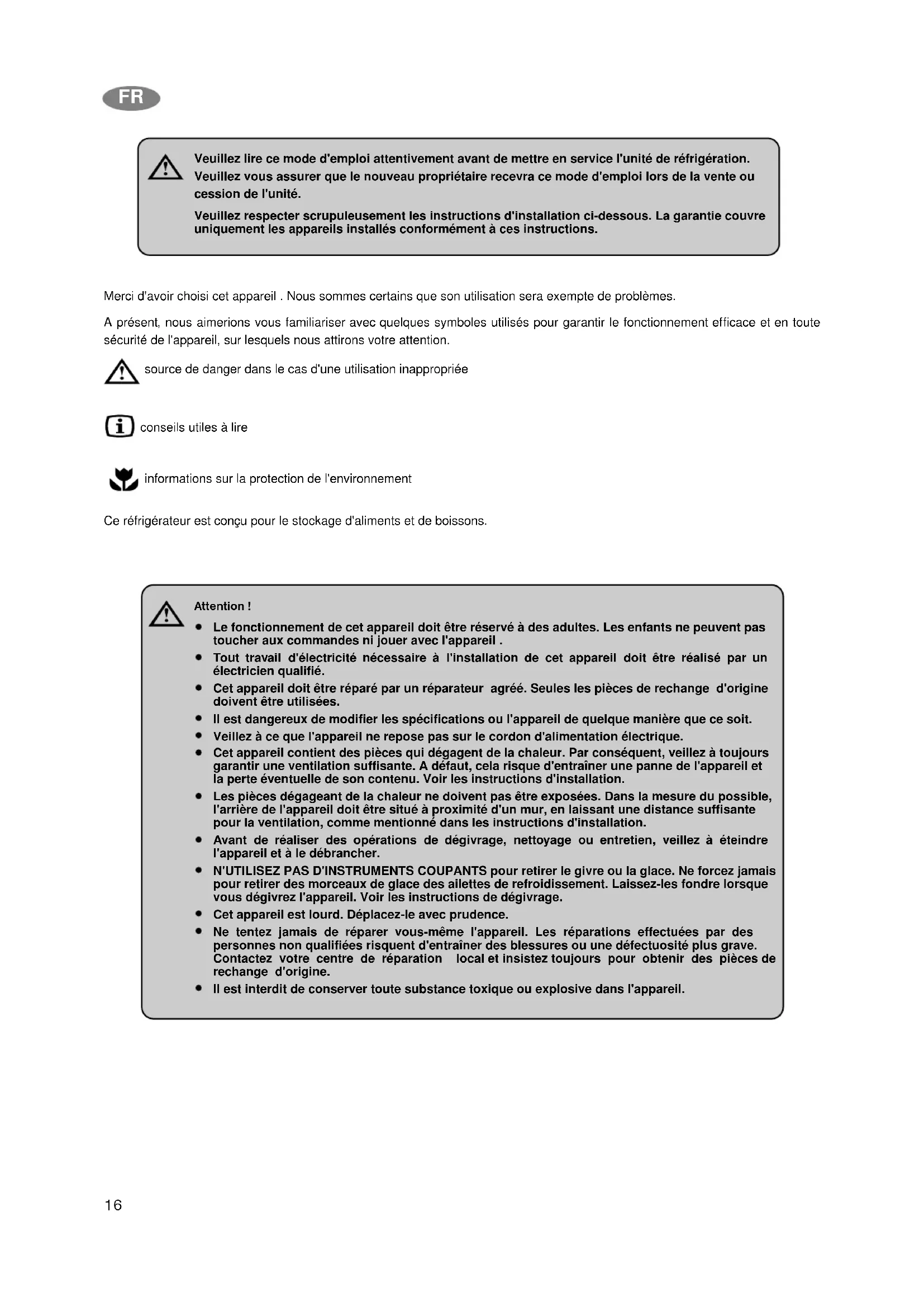 FI16 Merci d'avoir choisi cet appareil . Nous sommes certains que son utilisation sera exempte de problèmes. A présent, nous aimerions vous familiariser avec quelques symboles utilisés pour garantir le fonctionnement efficace et en toute sécurité de l'appareil, sur lesquels nous attirons votre attention. source de danger dans le cas d'une utilisation inappropriée conseils utiles à lire informations sur la protection de l'environnement Ce réfrigérateur est conçu pour le stockage d'aliments et de boissons. Attention ! Le fonctionnement de cet appareil doit être réservé à des adultes. Les enfants ne peuvent pas toucher aux commandes ni jouer avec l'appareil . Tout travail d'électricité nécessaire à l'installation de cet appareil doit être réalisé par un électricien qualifié. Cet appareil doit être réparé par un réparateur agréé. Seules les pièces de rechange d'origine doivent être utilisées. Il est dangereux de modifier les spécifications ou l'appareil de quelque manière que ce soit. Veillez à ce que l'appareil ne repose pas sur le cordon d'alimentation électrique. Cet appareil contient des pièces qui dégagent de la chaleur. Par conséquent, veillez à toujours garantir une ventilation suffisante. A défaut, cela risque d'entraîner une panne de l'appareil et la perte éventuelle de son contenu. Voir les instructions d'installation. Les pièces dégageant de la chaleur ne doivent pas être exposées. Dans la mesure du possible, l'arrière de l'appareil doit être situé à proximité d'un mur, en laissant une distance suffisante pour la ventilation, comme mentionné dans les instructions d'installation. Avant de réaliser des opérations de dégivrage, nettoyage ou entretien, veillez à éteindre l'appareil et à le débrancher. N'UTILISEZ PAS D'INSTRUMENTS COUPANTS pour retirer le givre ou la glace. Ne forcez jamais pour retirer des morceaux de glace des ailettes de refroidissement. Laissez-les fondre lorsque vous dégivrez l'appareil. Voir les instructions de dégivrage. Cet appareil est lourd. Déplacez-le avec prudence. Ne tentez jamais de réparer vous-même l'appareil. Les réparations effectuées par des personnes non qualifiées risquent d'entraîner des blessures ou une défectuosité plus grave. Contactez votre centre de réparation local et insistez toujours pour obtenir des pièces de rechange d'origine. Il est interdit de conserver toute substance toxique ou explosive dans l'appareil. Veuillez lire ce mode d'emploi attentivement avant de mettre en service l'unité de réfrigération. Veuillez vous assurer que le nouveau propriétaire recevra ce mode d'emploi lors de la vente ou cession de l'unité. Veuillez respecter scrupuleusement les instructions d'installation ci-dessous. La garantie couvre uniquement les appareils installés conformément à ces instructions. FR17