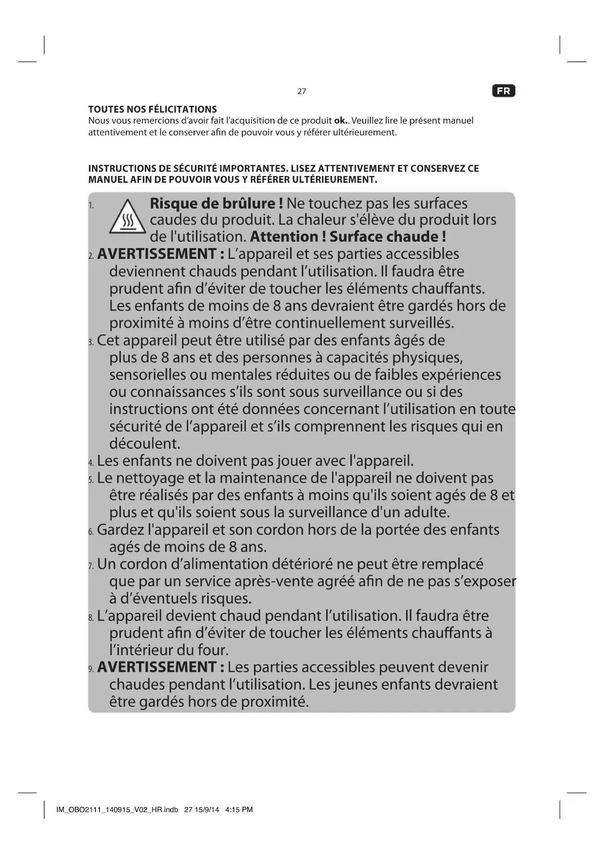 chaudes pendant l’utilisation. Les jeunes enfants devraient être gardés hors de proximité. IM_OBO2111_140915_V02_HR.indb 27 15/9/14 4:15 PM28