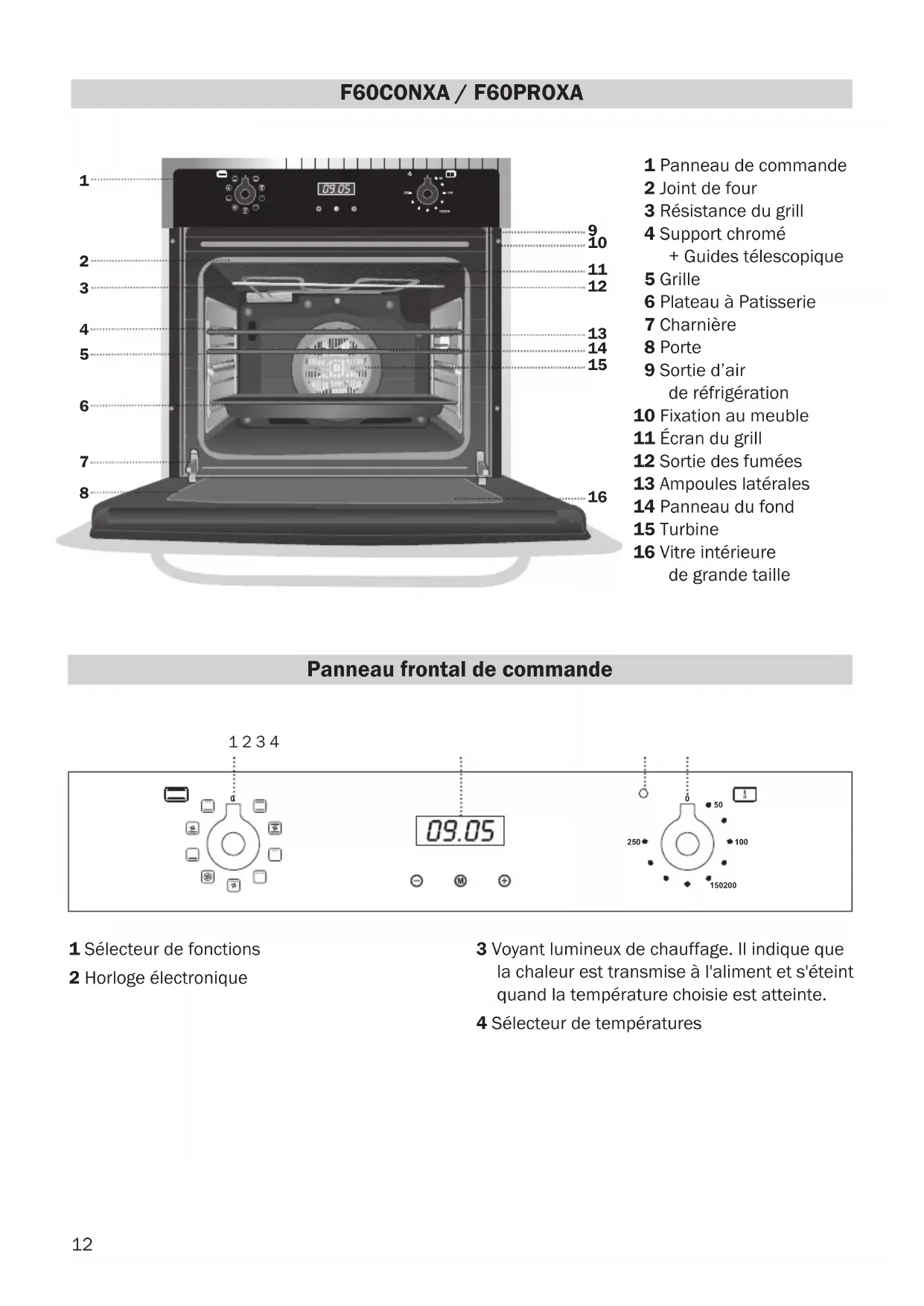 Panneau frontal de commande 11 Panneau de commande 12 Joint de four 13 Résistance du grill 14 Support chromé + Guides télescopique 15 Grille 16 Plateau à Patisserie 17 Charnière 18 Porte 19 Sortie d’air de réfrigération 10 Fixation au meuble 11 Écran du grill 12 Sortie des fumées 13 Ampoules latérales 14 Panneau du fond 15 Turbine 16 Vitre intérieure de grande taille 1 Sélecteur de fonctions 2 Horloge électronique 3 Voyant lumineux de chauffage. Il indique que la chaleur est transmise à l'aliment et s'éteint quand la température choisie est atteinte. 4 Sélecteur de températures