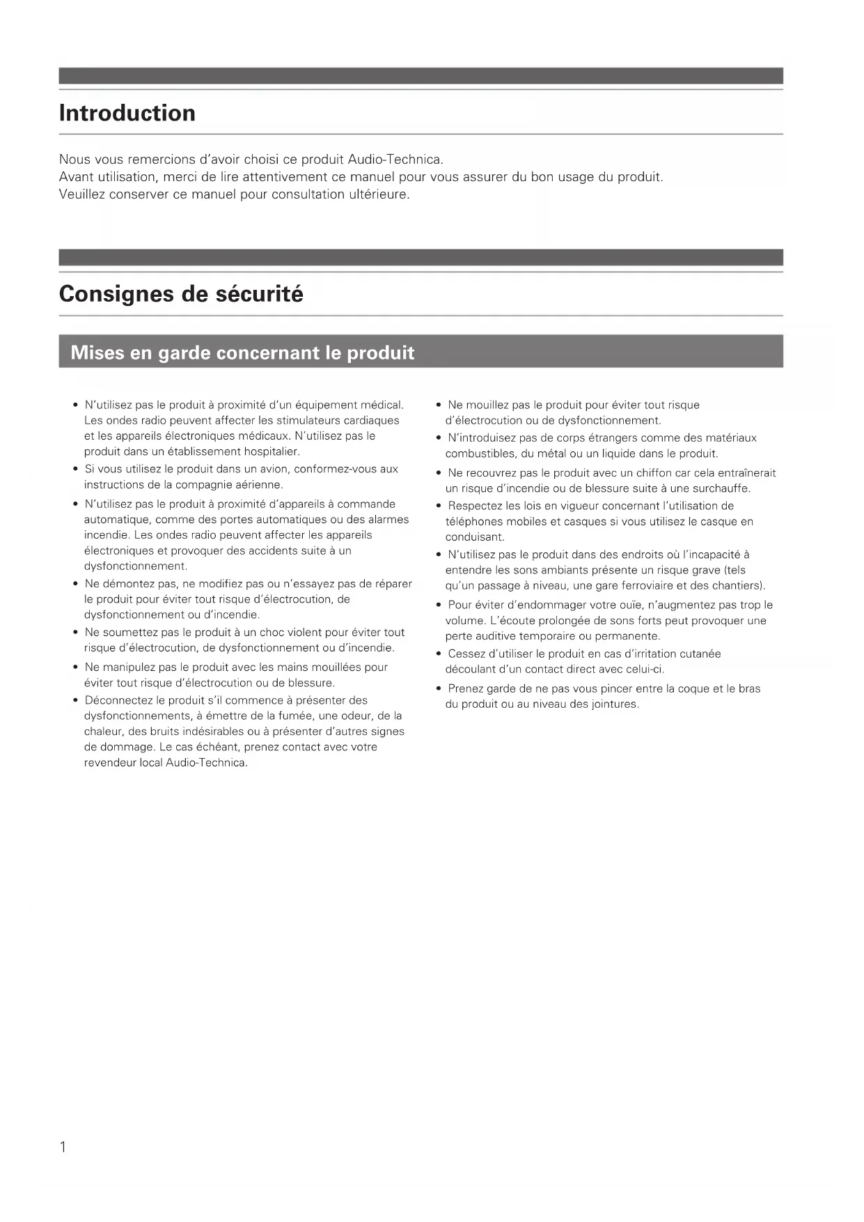 - Android is a trademark of Google Inc. ATH-AR3BT_UM_V2_10L_book.indb 16 2017/02/10 9:211 Nous vous remercions d’avoir choisi ce produit Audio-Technica. Avant utilisation, merci de lire attentivement ce manuel pour vous assurer du bon usage du produit. Veuillez conserver ce manuel pour consultation ultérieure. Introduction Consignes de sécurité Mises en garde concernant le produit