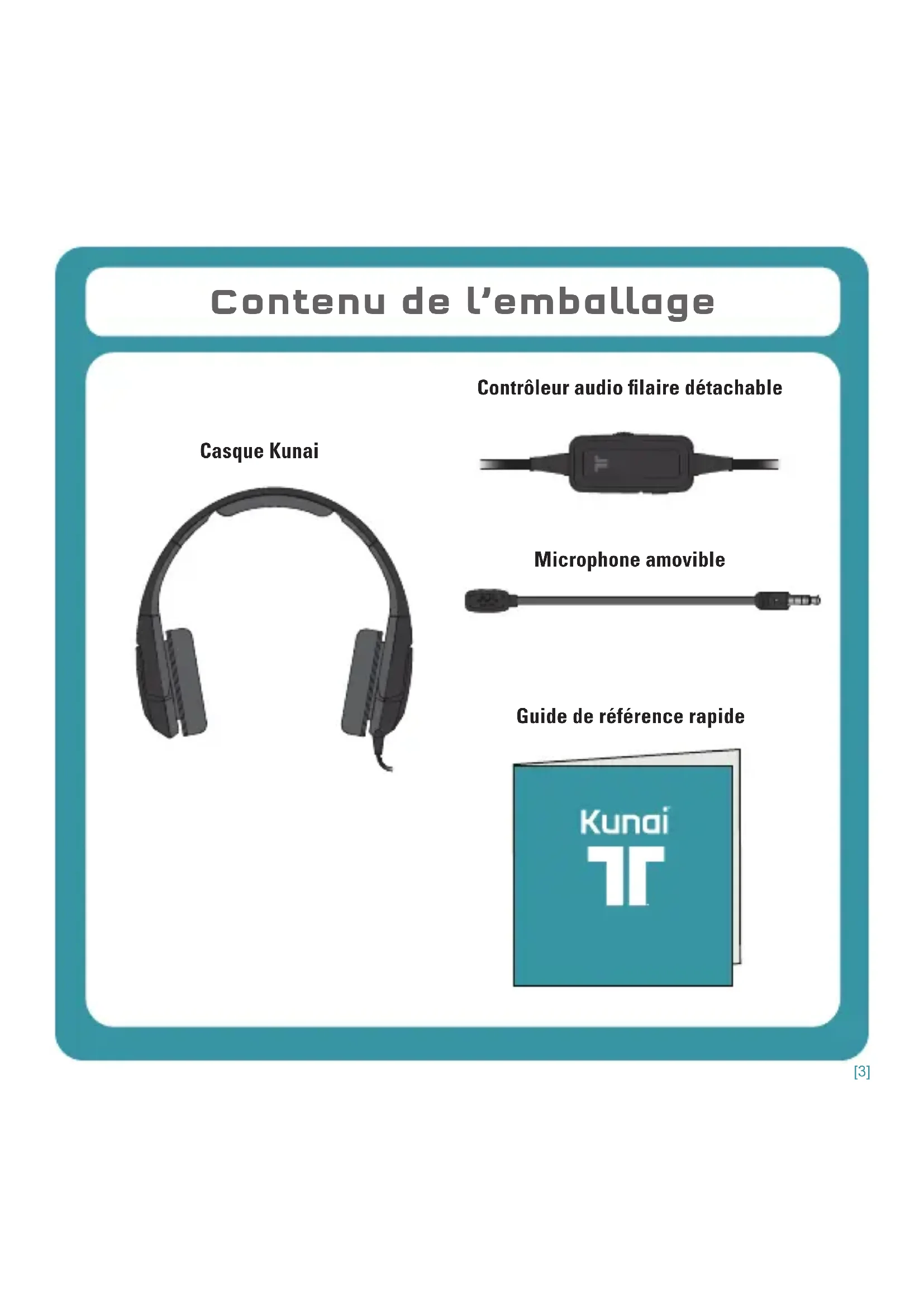 - Assistance Technique Table des matières[3] Contenu de l’emballage Guide de référence rapide Casque Kunai Contrôleur audio filaire détachable Microphone amovible[4] Connexion du microphone p. 12