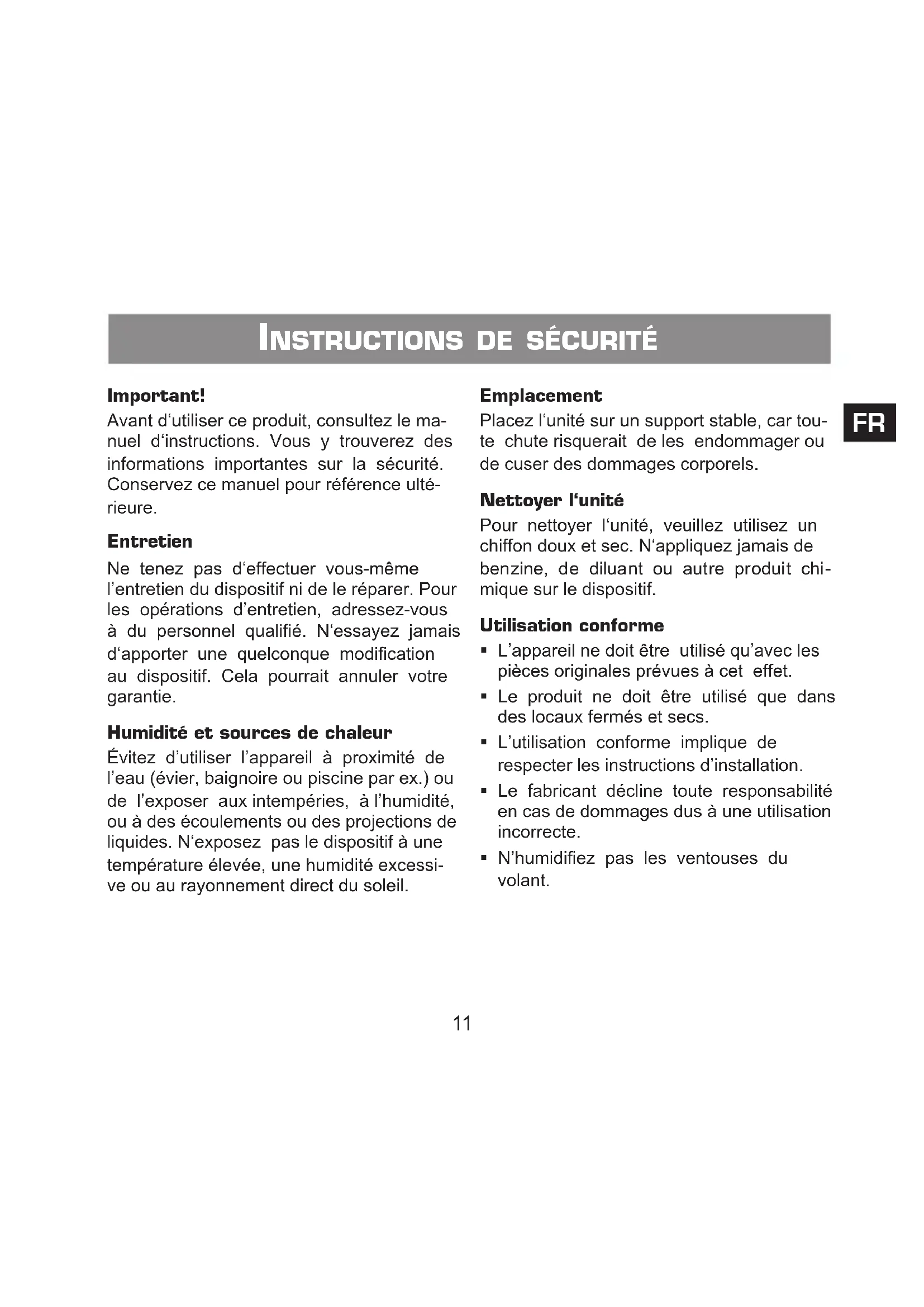 - Le produit ne doit être utilisé que dans des locaux fermés et secs.