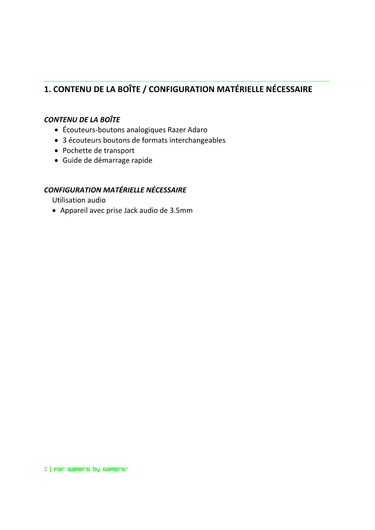 INFORMATIONS DE DROITS D’AUTEUR ET D’AUTRES DROITS DE PROPRIÉTÉ INTELLECTUELLE Copyright © 2025 Razer Inc. Tous droits réservés. Razer, For Gamers By Gamers, et le logo du serpent à trois têtes sont des marques commerciales ou des marques déposées de Razer Inc. et/ou de sociétés affiliées aux États-Unis ou dans d'autres pays Toutes les autres marques de commerce appartiennent à leurs propriétaires respectifs. Razer Inc. (« Razer ») peut avoir des droits d auteur, des marques de commerce, des secrets de fabrique, des brevets, des dépôts de brevets ou d autres droits liés à la propriété intellectuelle (qu ils soient déposés ou non) en rapport avec le produit, sujet de ce manuel principal. La distribution de ce manuel principal ne vous accorde aucune licence concernant ces droits d'auteur, marques de commerce, brevets ou autres droits de propriété intellectuelle. Le Écouteurs-boutons analogiques Razer Adaro (le « Produit ») peut différer des images, que ce soit sur l’emballage ou ailleurs. La société Razer réfute toute responsabilité relativement aux erreurs pouvant s'être glissées dans ce document. Les informations figurant dans les présentes sont sujettes à modification sans préavis.