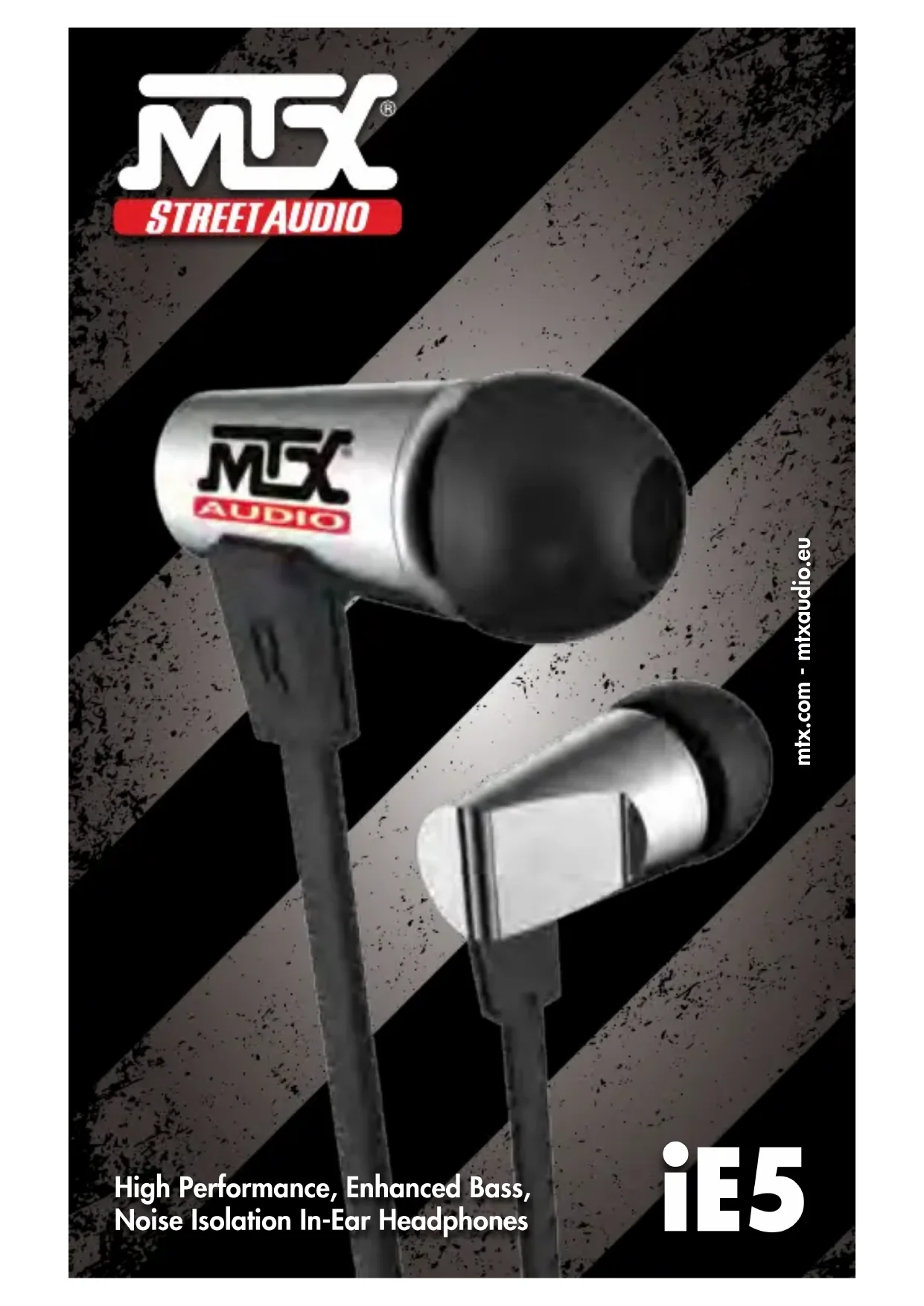 - Europe, Middle East and Africa, please visit mtxaudio.eu Speaker Design: Each speaker utilizes a single 10mm driver to deliver exceptional sound quality and bass. Flat Tangle Free Cable: The iE5 audio cable features a flat tangle free design that allows you to remove your iE5 from the carrying case or your pocket without worrying about it being knotted. Aluminum Headphones and Plugs: The enclosures and 3.5mm connectors on the audio cables are constructed of durable aluminum providing increased reliability as well as excellent aesthetics. Durable Protective Carrying Case Included. Specications: Sensitivity : 117dB (1mW) Impedance : 16Ω Frequency Response : 10Hz-25000Hz Speakers 2x 10mmiE5 - Manuel Merci d’avoir fait confiance à MTX pour votre nouveau casque à hautes performances. Nous avons passé un temps incalculable à l’optimisation de la qualité sonore, au confort et à la qualité de fabrication de l’iE5. Il vous permettra de transporter la plus incroyable chaine Hi-Fi partout où vous irez. C’est votre nouvel outil technologique indispen- sable. Félicitations, et profitez bien d’MTX en musique. Télécommande et Micro : Le micro télécommande est universel et ultra léger. Il est compatible avec les appareils Apple® et Android®. La télécommande permet de mettre en lecture, en pause, de prendre un appel et de racrocher. En mode téléphone : Appuyer une fois pour répondre à un appel, appuyer une nouvelle fois pour raccrocher. En mode baladeur : Appuyer une fois pour passer en pause, appuyer une nouvelle fois pour passer en lecture. Appuyer deux fois pour passer à la chanson suivante. Appuyer trois fois pour revenir en arrière d’une chanson. Avec les appareils Apple®, un appui long lance Siri®. Comment diérencier la droite et la gauche ?