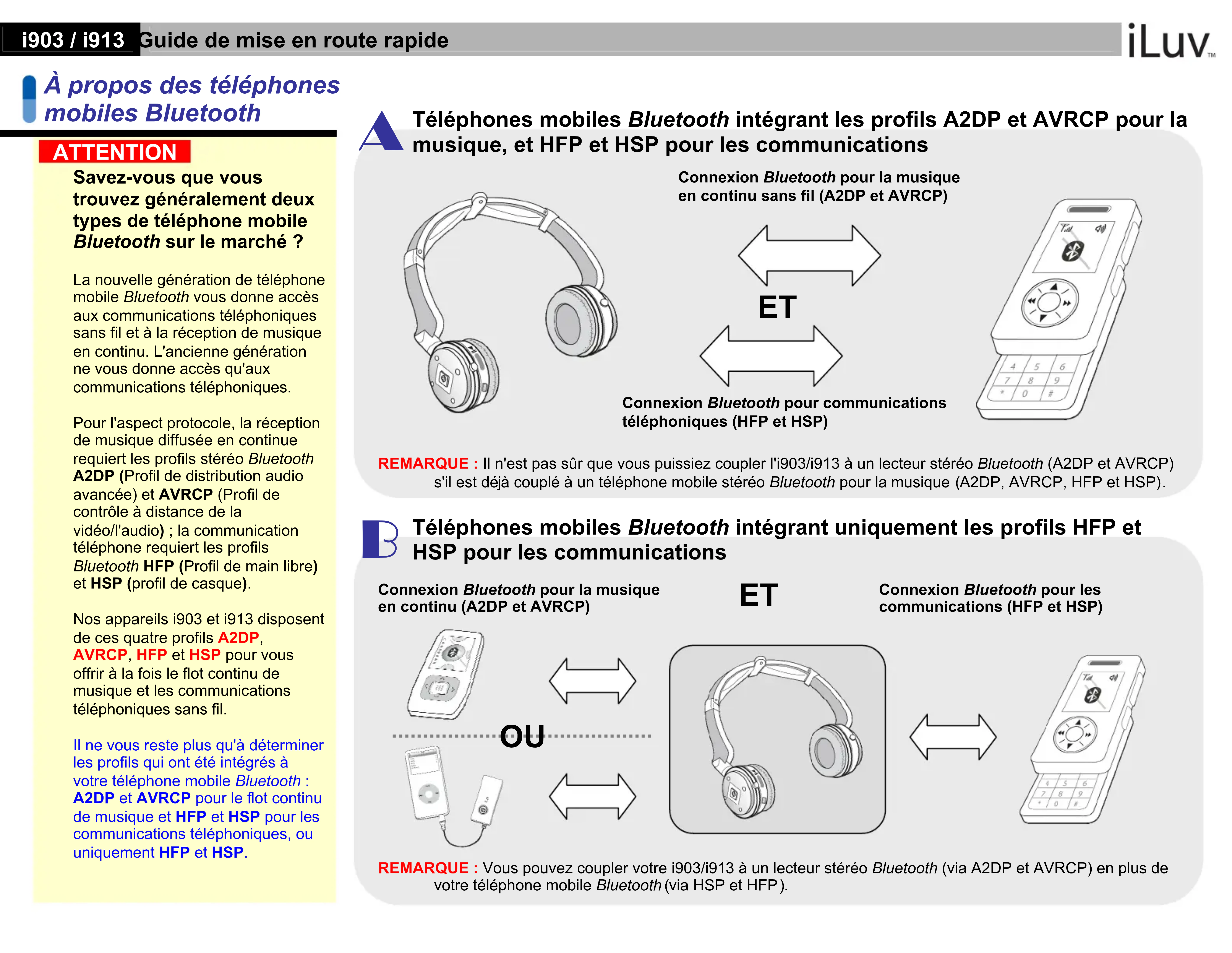 Nos apparèils i903 et i913 disposènt de ces quatre profils A2DP, AVRCP, HFP et HSP pour vous offrir à la fois le flot continu de musique et les communications téléphoniques sans fil.
