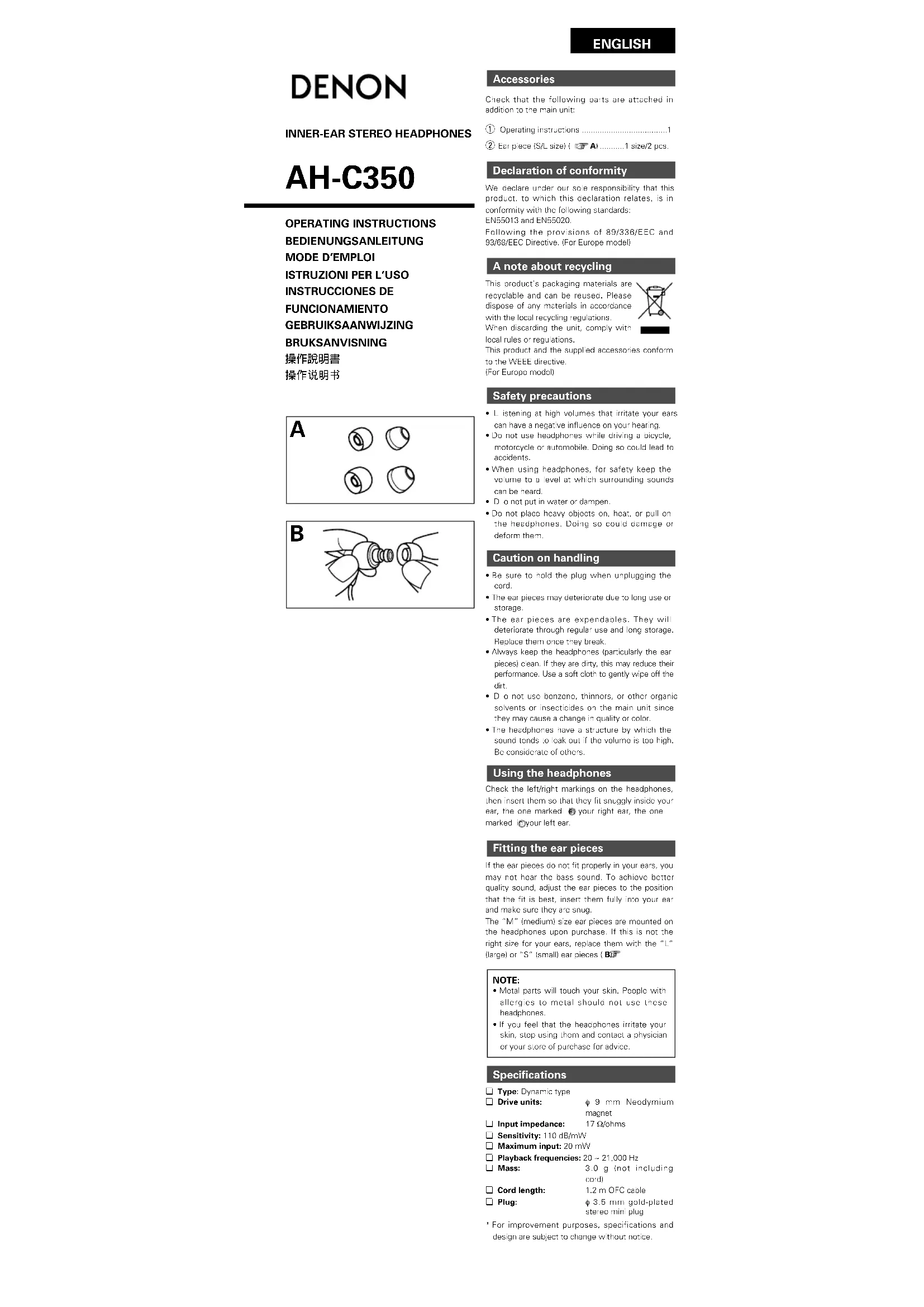 AHC350K - Ecouteur DENON - Notice d'utilisation et mode d'emploi gratuit