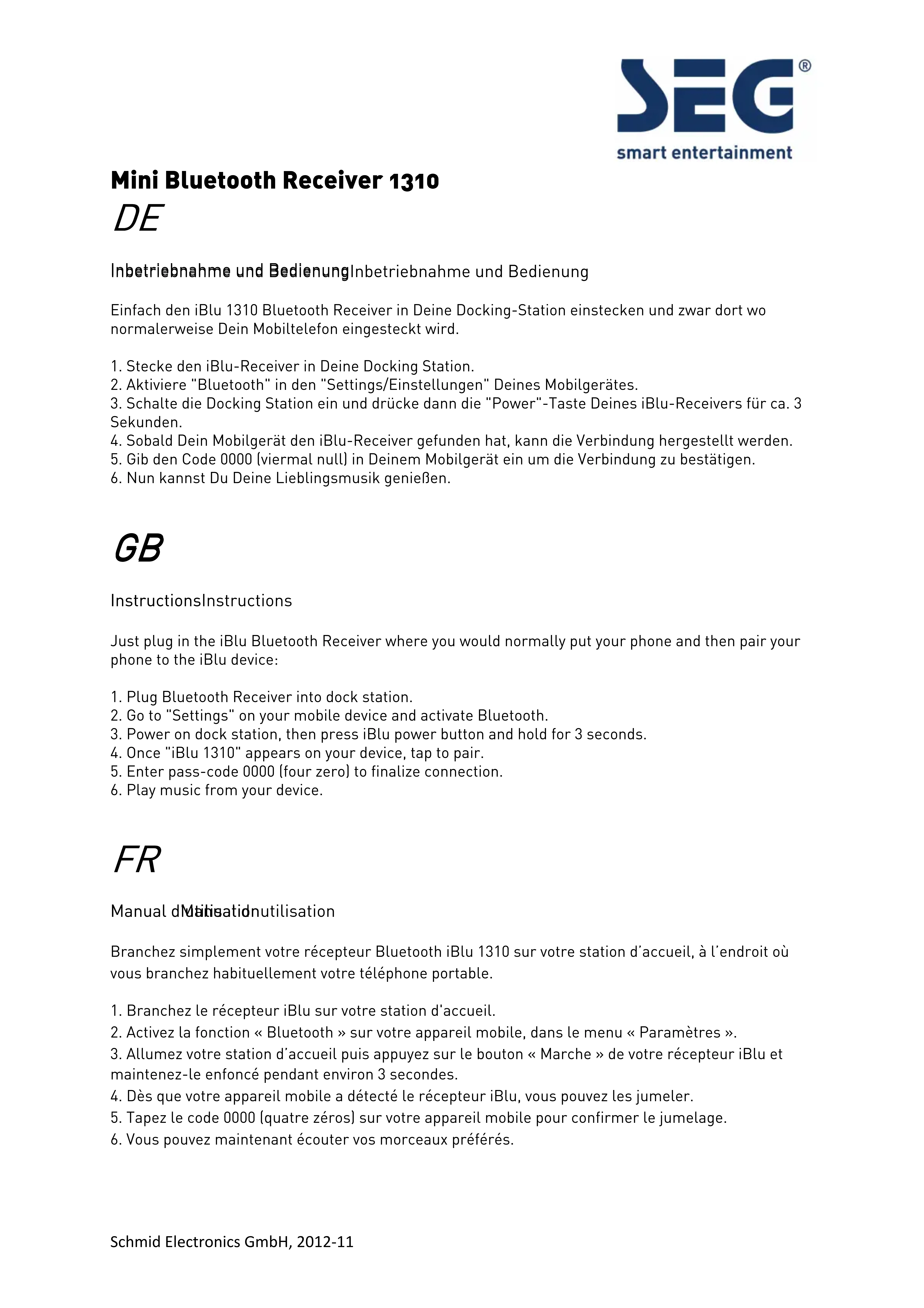 Téléchargez la notice de votre Haut-parleur au format PDF gratuitement ! Retrouvez votre notice iBlu 1310 - SEG et reprennez votre appareil électronique en main. Sur cette page sont publiés tous les documents nécessaires à l'utilisation de votre appareil iBlu 1310 de la marque SEG.