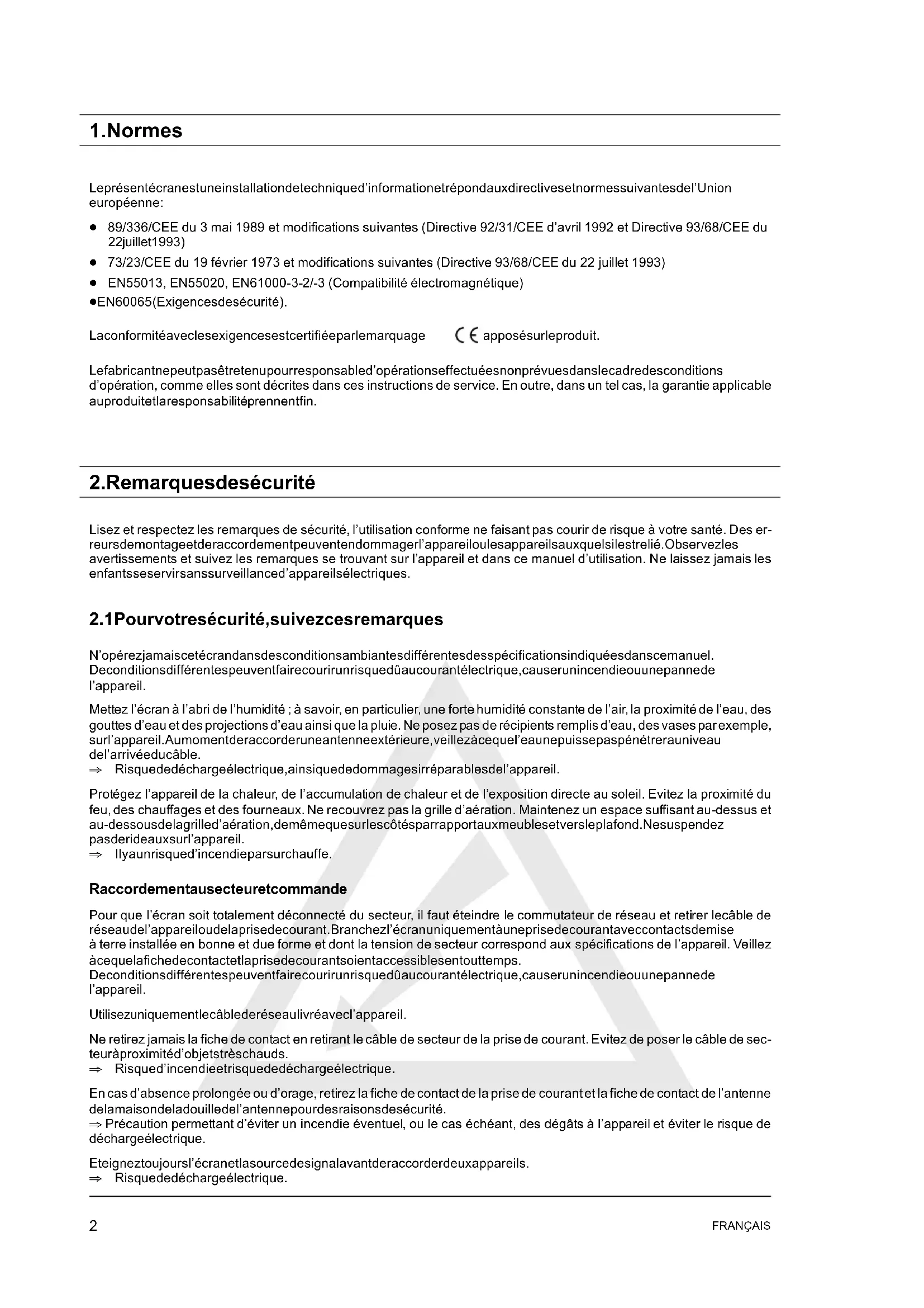 Le présent écran est une installation de technique d’information et répond aux directives et normes suivantes de l’Union européenne : D 89/336/CEE du 3 mai 1989 et modifications suivantes (Directive 92/31/CEE d’avril 1992 et Directive 93/68/CEE du 22 juillet 1993) D 73/23/CEE du 19 février 1973 et modifications suivantes (Directive 93/68/CEE du 22 juillet 1993) D EN55013, EN55020, EN61000 -3-2/-3 (Compatibilité électromagnétique) D EN60065 (Exigences de sécurité). La conformité avec les exigences est certifiée par le marquage apposé sur le produit. Le fabricant ne peut pas être tenu pour responsable d’opérations effectuées non prévues dans le cadre des conditions d’opération, comme elles sont décrites dans ces instructions de service. En outre, dans un tel cas, la garantie applicable au produit et la responsabilité prennent fin.