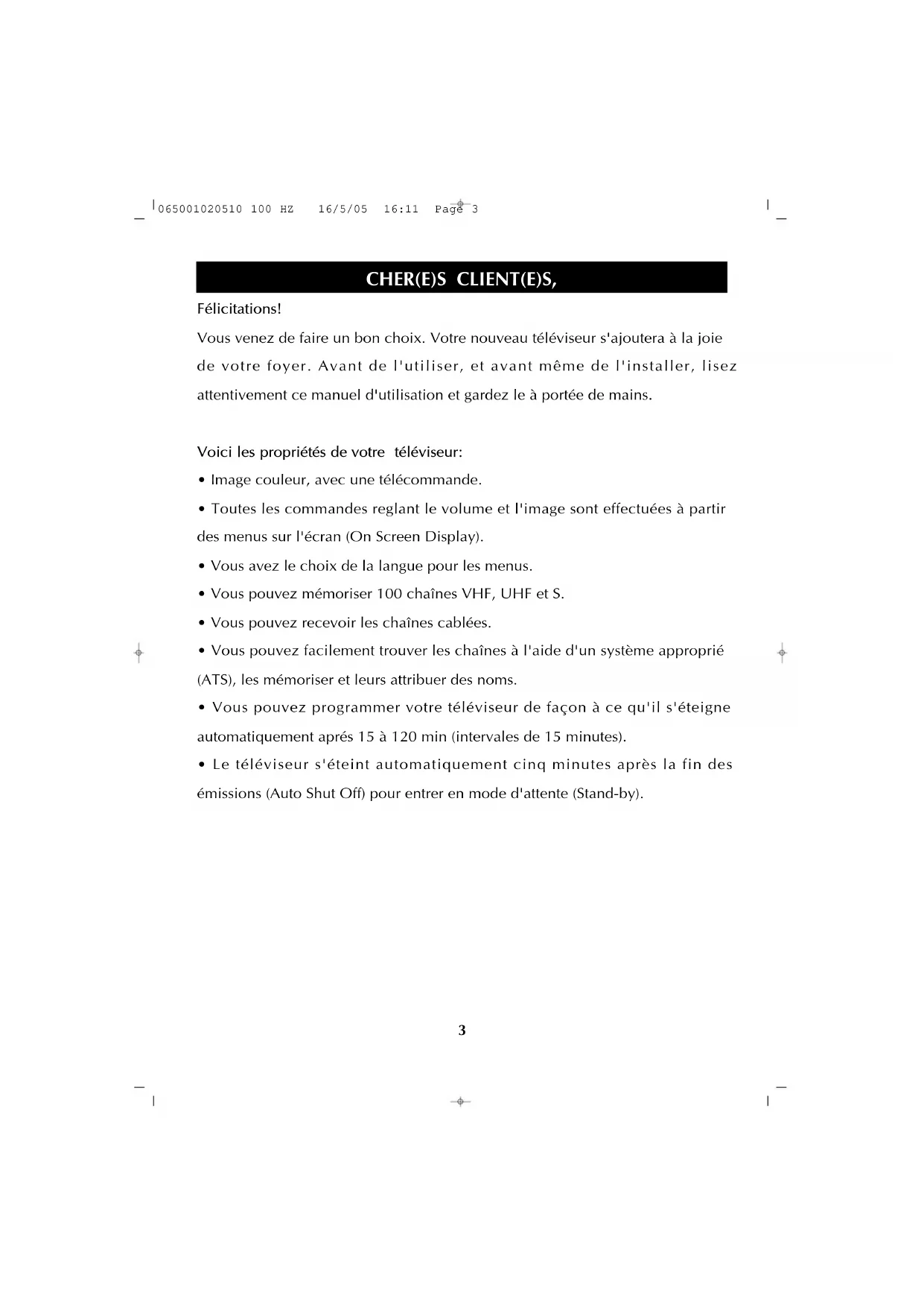 - Le téléviseur s'éteint automatiquement cinq minutes après la fin des émissions (Auto Shut Off) pour entrer en mode d'attente (Stand-by). CHER(E)S CLIENT(E)S, 065001020510 100 HZ 16/5/05 16:11 Page 34 CCoommmmee UUnn PPrreemmiieerr PPaass...... Pour prévenir le danger d'un contact électrique ou d'un incendie, protégez votre téléviseur de la pluie et de l'humidité.