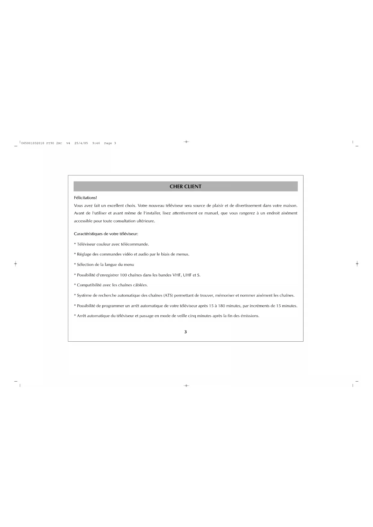 - Arrêt automatique du téléviseur et passage en mode de veille cinq minutes après la fin des émissions. 065001032010 PT90 2RC V4 25/4/05 9:46 Page 3CONSIGNES DE SÉCURITÉ