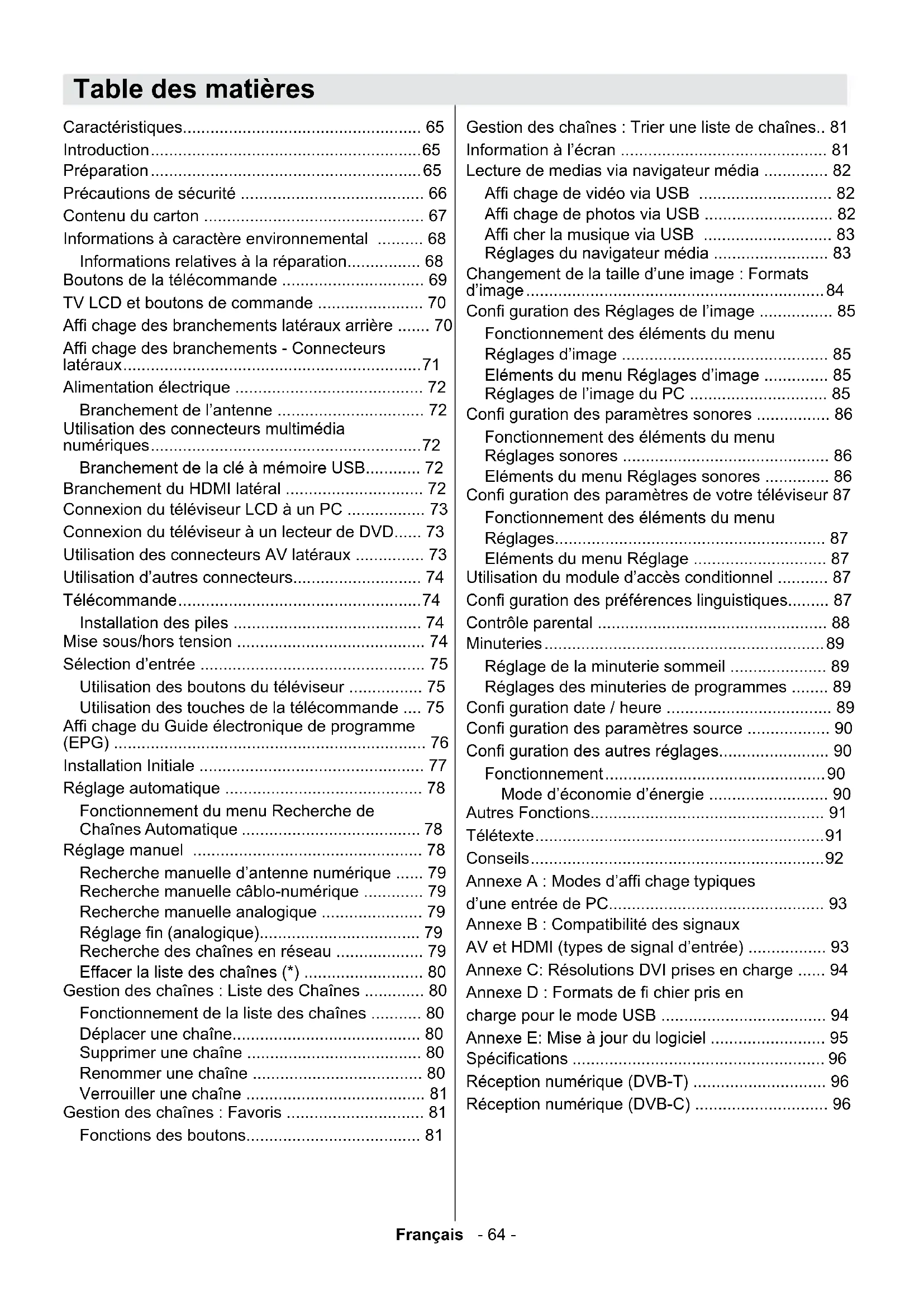 ? Le son sort d’un seul haut-parleur. Est-ce que la balance est à l’extrémité d’une direction ? Consultez le menu Son. Télécommande: Votre téléviseur ne répond pas à la télécommande. Les piles sont probablement épuisées. Si oui, vous pouvez utiliser les boutons du téléviseur. Sources d’entrée: Si vous ne pouvez sélectionner aucune source d’entrée, il est possible qu’aucun périphérique ne soit connecté. Vérifi ez les câbles AV et les branchements si vous avez essayé de brancher un appareil.Français - 93 - Annexe A : Modes d’affi chage typiques d’une entrée de PC L’écran dispose d’une résolution maximale de 1360 x 768. Le tableau suivant illustre certains modes d’affi chage vidéo typiques. Votre téléviseur ne peut pas prendre en charge différentes résolutions. Les modes de résolution pris en charge fi gurent sur la liste ci-dessous. Si vous faites passer votre PC à un mode non pris en charge, un message d’avertissement apparaît à l’écran. Index Résolution Fréquence 1 640x400 70 Hz 2 640x480 60 Hz 3 640x480 75 Hz 4 800x600 60 Hz 5 800x600 75 Hz 6 1024x768 60 Hz 7 1024x768 70 Hz 8 1024x768 75 Hz 9 1152x864 75 Hz 10 1280x768 60 Hz 11 1280x1024 60 Hz 12 1360x768 60 Hz Annexe B : Compatibilité des signaux AV et HDMI (types de signal d’entrée) Source Signaux pris en charge Disponible EXT-1 (PERITEL 1) PAL 50/60 O NTSC 60 O RGB 50 O RGB 60 O EXT-2 (PERITEL-2) PAL 50/60 O NTSC 60 O RGB 50 X RGB 60 X SIDE AV PAL 50/60 O NTSC 60 O YPbPr 480I 60Hz O 480P 60Hz O 576I 50Hz O 576P 50Hz O 720P 50Hz O 720P 60Hz O 1080I 50Hz O 1080I 60Hz O 1080P 50Hz O 1080P 60Hz O HDMI1 HDMI2 HDMI3 HDMI4 480I 60Hz O 480P 60Hz O 576I 50Hz O 576P 50Hz O 720P 50Hz O 720P 60Hz O 1080I 50Hz O 1080I 60Hz O 1080P 50Hz O 1080P 60Hz O 1080P 24 HZ O (X: Non disponible, O: Disponible) Dans certains cas, un signal sur l’écran du téléviseur LCD peut ne pas s’affi cher correctement. Le problème peut être une incompatibilité avec les normes de l’équipement source (DVD, décodeur, etc.). Si vous rencontrez un tel problème, veuillez contacter votre fournisseur et le fabricant de l’appareil source.Français - 94 - Annexe C: Résolutions DVI prises en charge Reportez-vous aux résolutions suivantes au moment de raccorder les connecteurs à votre téléviseur à l’aide des câbles DVI (non fournis). 24Hz 25Hz 30Hz 50Hz 60Hz 480i