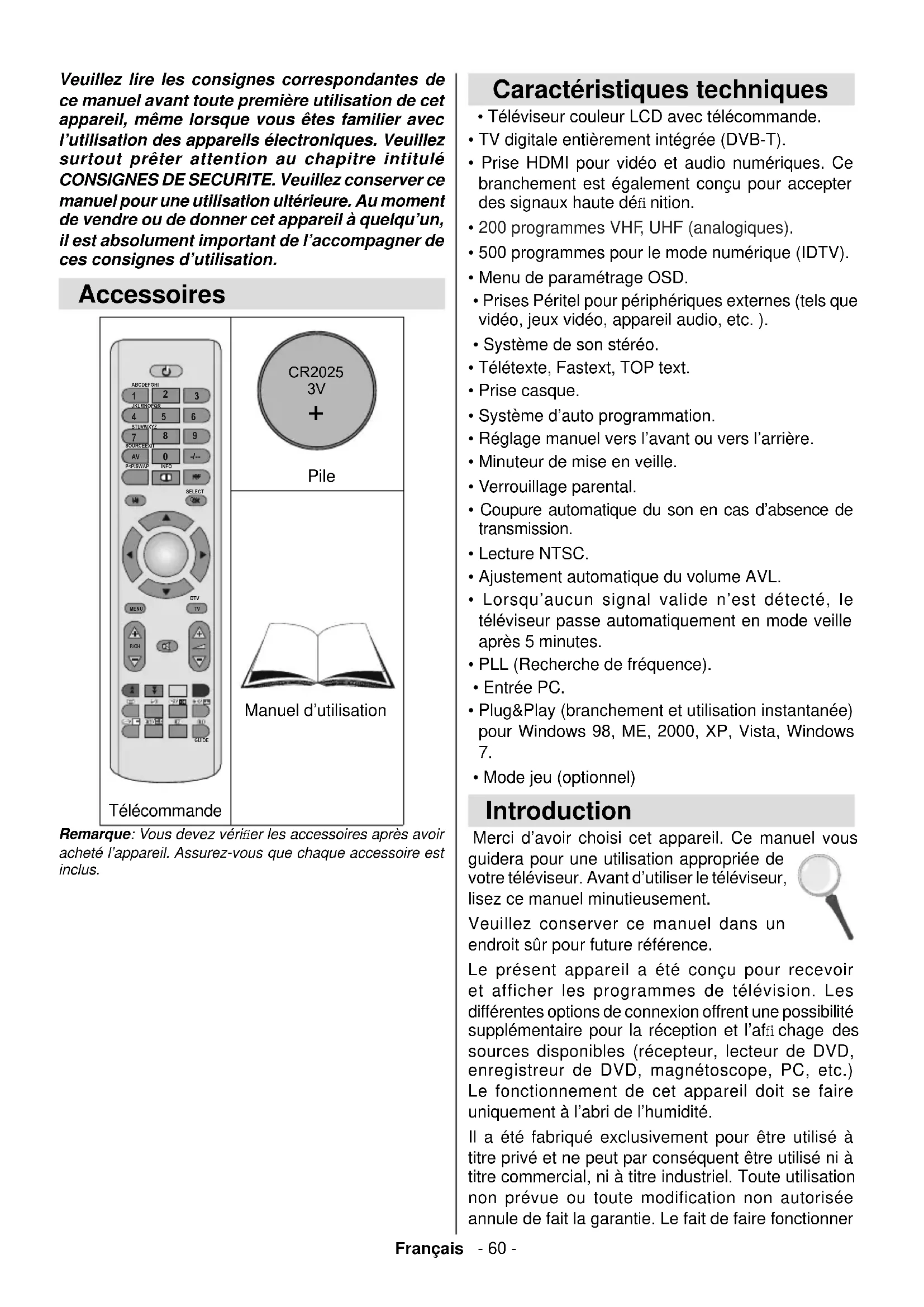 - Caractéristiques techniques A03_MB45_[FR]_(01-TV)_1186UK_IDTV_BRONZE11_22841W_10067445_50164048.indd 1A03_MB45_[FR]_(01-TV)_1186UK_IDTV_BRONZE11_22841W_10067445_50164048.indd 1 10.02.2010 17:22:0610.02.2010 17:22:06Français - 60 - Veuillez lire les consignes correspondantes de ce manuel avant toute première utilisation de cet appareil, même lorsque vous êtes familier avec l’utilisation des appareils électroniques. Veuillez surtout prêter attention au chapitre intitulé CONSIGNES DE SECURITE. Veuillez conserver ce manuel pour une utilisation ultérieure. Au moment de vendre ou de donner cet appareil à quelqu’un, il est absolument important de l’accompagner de ces consignes d’utilisation. Accessoires p. 88