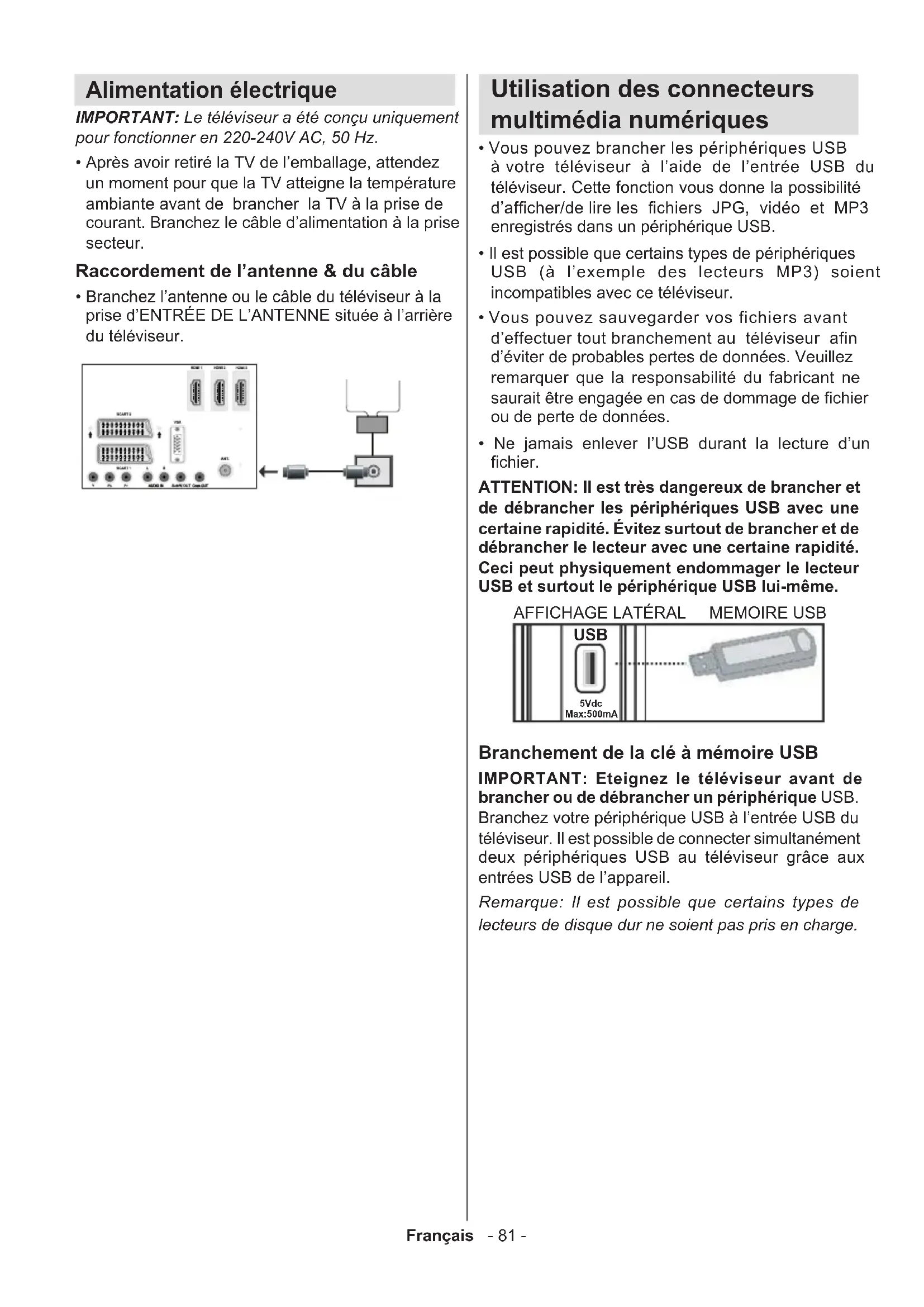 5Vdc Max:500mA 5Vdc Max:500mA SIDE AV HDMI MODE oFrançais - 81 - Alimentation électrique IMPORTANT: Le téléviseur a été conçu uniquement pour fonctionner en 220-240V AC, 50 Hz.