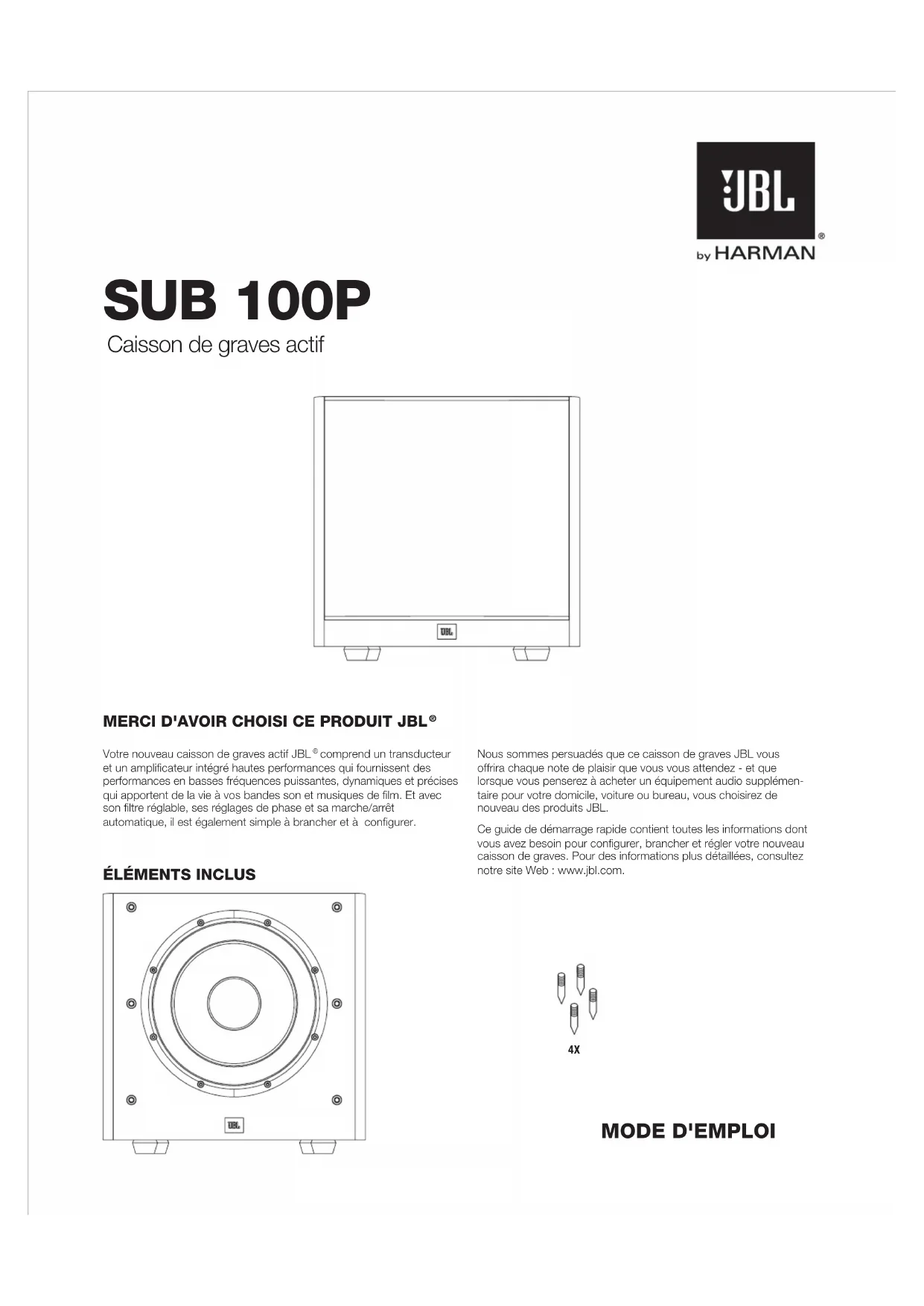 comprend un transducteur et un amplificateur intégré hautes performances qui fournissent des performances en basses fréquences puissantes, dynamiques et précises qui apportent de la vie à vos bandes son et musiques de film. Et avec son filtre réglable, ses réglages de phase et sa marche/arrêt automatique, il est également simple à brancher et à configurer. Nous sommes persuadés que ce caisson de graves JBL vous offrira chaque note de plaisir que vous vous attendez - et que lorsque vous penserez à acheter un équipement audio supplémen- taire pour votre domicile, voiture ou bureau, vous choisirez de nouveau des produits JBL. Ce guide de démarrage rapide contient toutes les informations dont vous avez besoin pour configurer, brancher et régler votre nouveau caisson de graves. Pour des informations plus détaillées, consultez notre site Web : www.jbl.com. Caisson de graves actif