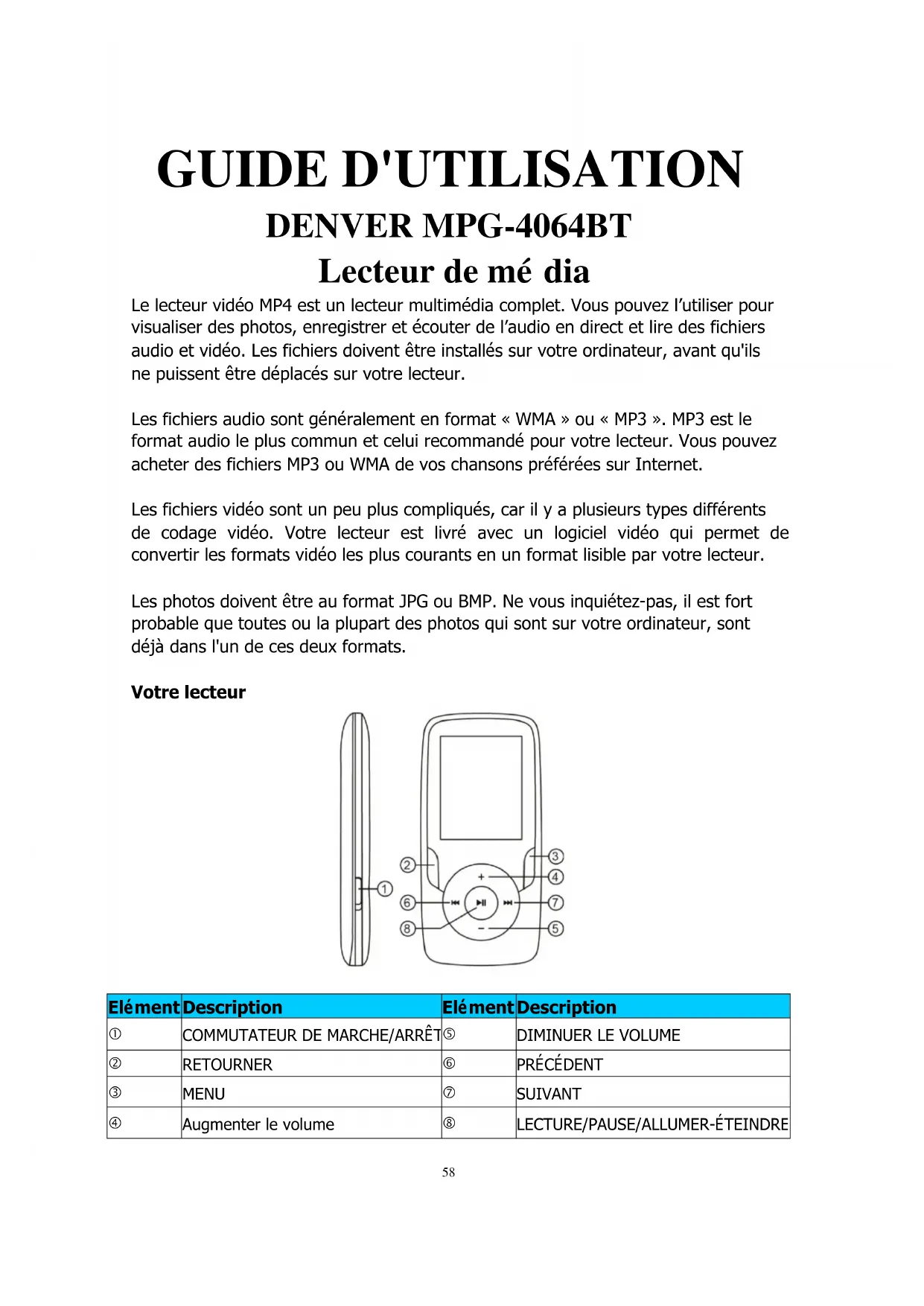 MPG4064BT - Lecteur mp3 DENVER - Notice d'utilisation et mode d'emploi gratuit