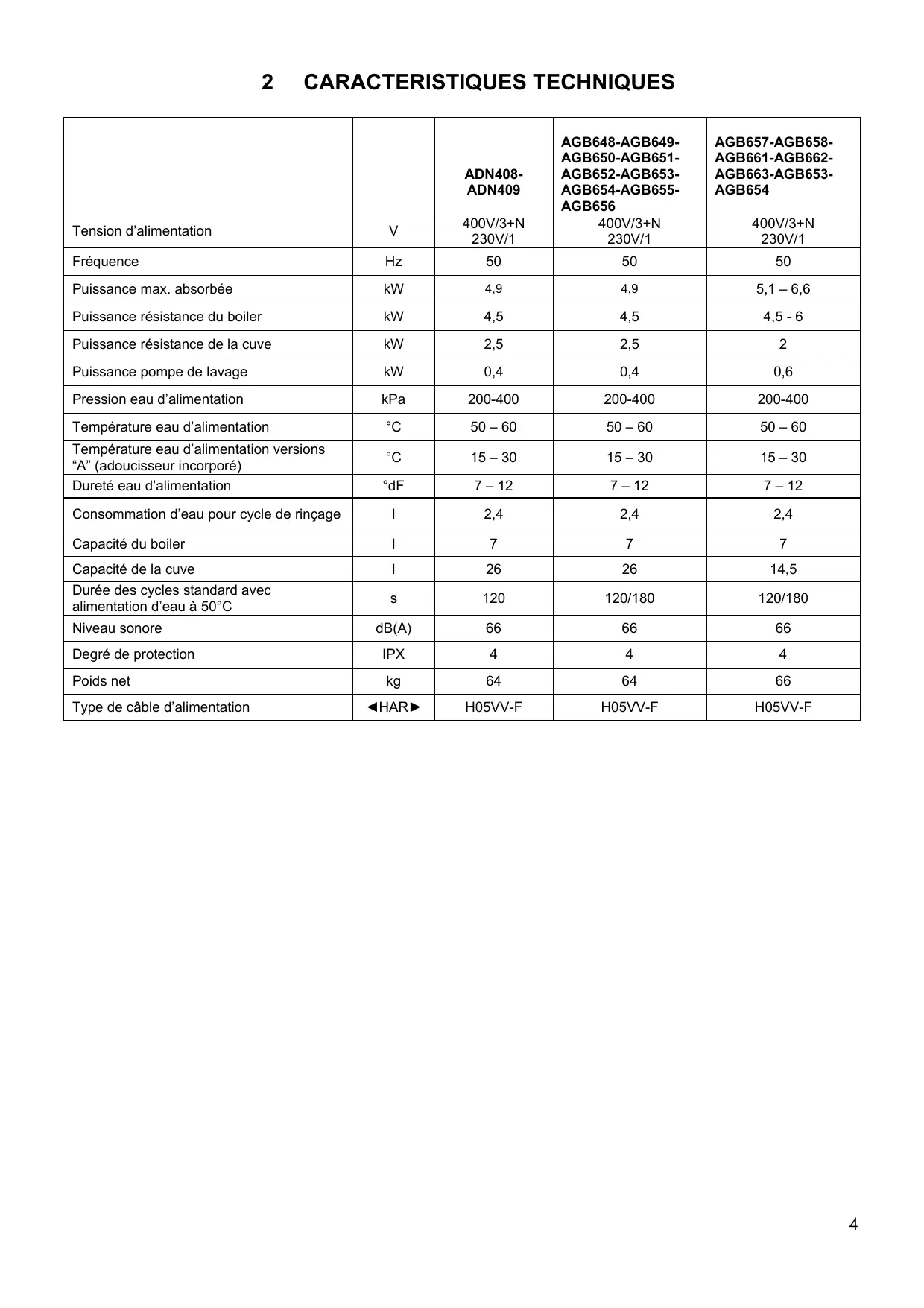 Température eau d’alimentation versions “A” (adoucisseur incorporé) Dureté eau d’alimentation