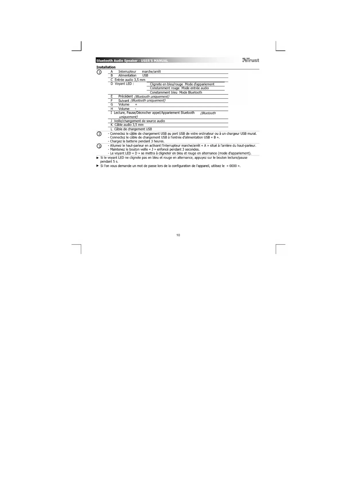 - Connectez le câble de chargement USB au port USB de votre ordinateur ou à un chargeur USB mural. - Connectez le câble de chargement USB à l’entrée d’alimentation USB « B ». - Chargez la batterie pendant 3 heures. - Allumez le haut-parleur en activant l’interrupteur marche/arrêt « A » situé à l'arrière du haut-parleur. - Maintenez le bouton veille « J » enfoncé pendant 3 secondes. - Le voyant LED « D » se mettra à clignoter en bleu et rouge en alternance (mode d'appariement). Si le voyant LED ne clignote pas en bleu et rouge en alternance, appuyez sur le bouton lecture/pause pendant 5 s. Si l'on vous demande un mot de passe lors de la configuration de l'appareil, utilisez le « 0000 ».