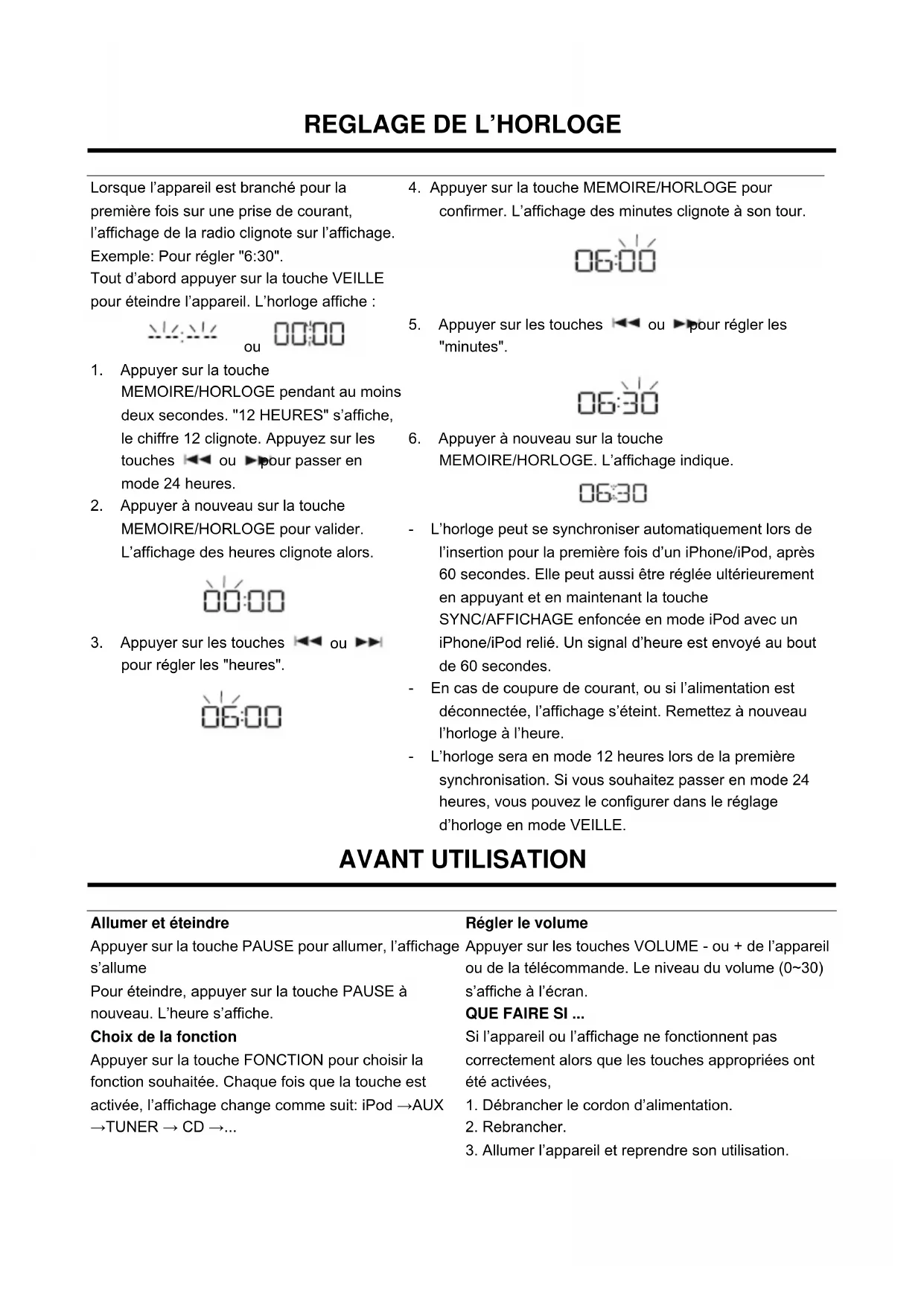 MEMOIRE/HORLOGE. L’affichage indique. - L’horloge peut se synchroniser automatiquement lors de l’insertion pour la première fois d’un iPhone/iPod, après 60 secondes. Elle peut aussi être réglée ultérieurement en appuyant et en maintenant la touche SYNC/AFFICHAGE enfoncée en mode iPod avec un iPhone/iPod relié. Un signal d’heure est envoyé au bout de 60 secondes. - En cas de coupure de courant, ou si l’alimentation est déconnectée, l’affichage s’éteint. Remettez à nouveau l’horloge à l’heure. - L’horloge sera en mode 12 heures lors de la première synchronisation. Si vous souhaitez passer en mode 24 heures, vous pouvez le configurer dans le réglage d’horloge en mode VEILLE. AVANT UTILISATION Allumer et éteindre Appuyer sur la touche PAUSE pour allumer, l’affichage s’allume Pour éteindre, appuyer sur la touche PAUSE à nouveau. L’heure s’affiche. Choix de la fonction Appuyer sur la touche FONCTION pour choisir la fonction souhaitée. Chaque fois que la touche est activée, l’affichage change comme suit: iPod →AUX