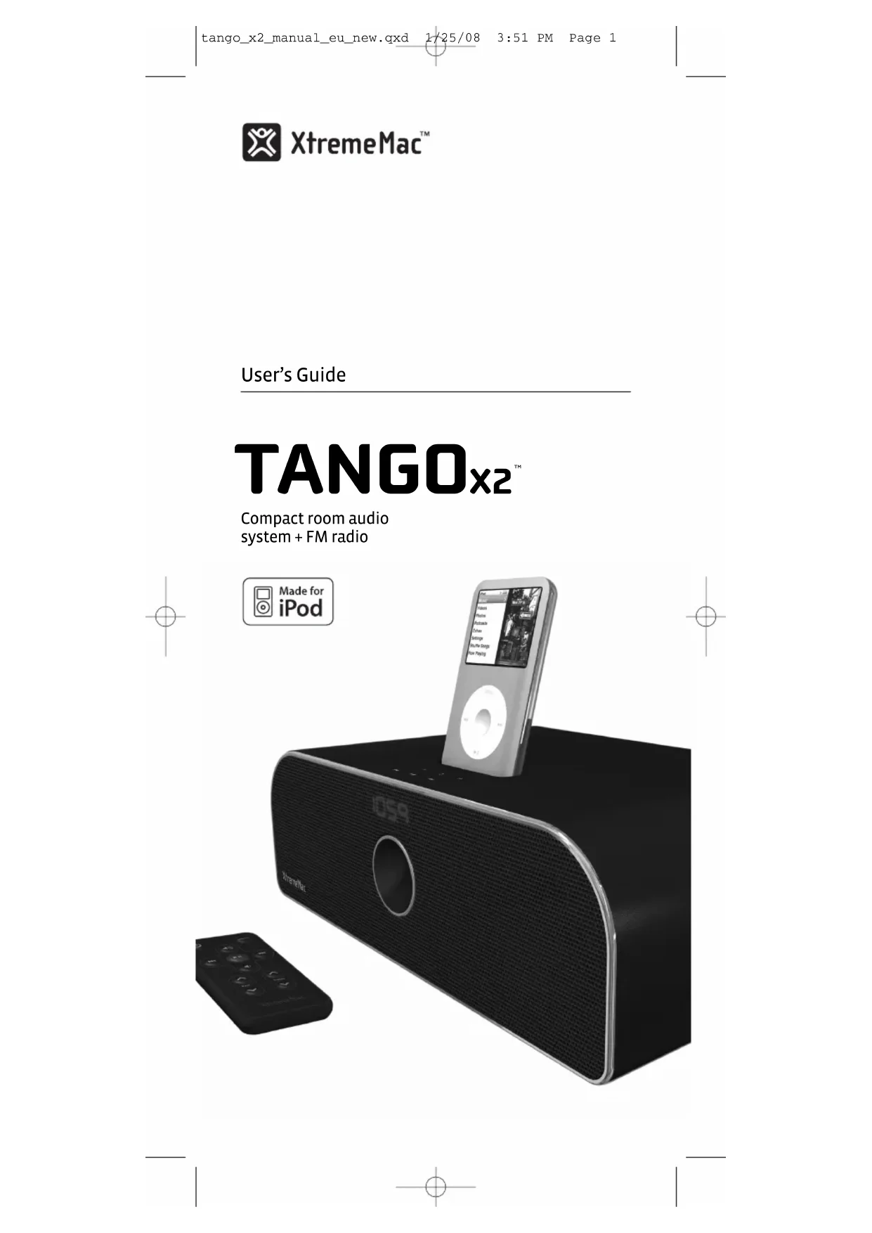 qualifié. Des travaux d’entretien sont nécessaires lorsque l’appareil est endommagé (la fiche ou le cordon d’alimentation est endommagé, du liquide s’est renversé ou des objets sont tombés dans l’appareil, l’appareil a été exposé à la pluie ou à l’humidité, ne fonctionne pas normalement ou est tombé). Pour l’entretien, adressez-vous à du personnel qualifié, retournez l’appareil au distributeur ou contactez l’assistance téléphonique de XtremeMac. Federal Communication Commission : testé et conforme à la règlementation de la FCC, section 15, sous-section B, sur les émissions rayonnées et par conduction des appareils de classe B. Cet appareil est conforme à la section 15 des règles FCC. Son fonctionnement est soumis aux conditions suivantes : cet appareil ne peut provoquer aucune interférence nuisible. Cet appareil doit accepter toutes les interférences reçues, y compris les interférences susceptibles d’entraîner un fonctionnement indésirable. Remarque : la règlementation FCC stipule que les modifications non expressément homologuées par XtremeMac risquent d’annuler le droit de l’utilisateur à faire fonctionner cet appareil. Conformité CE pour l’Europe : testé et conforme à la norme EN55013 sur les émissions RF et à la norme EN55020 sur l’immunité le cas échéant. Conformité C-Tick pour l’Australie : testé et conforme à la norme AS/NZ1053 sur les émissions RF suivant la réglementation de l’Australian Communications Authority. L’utilisation de ce symbole indique que ce produit ne doit pas être traité comme un déchet ménager ordinaire. En vous assurant d’ éliminer ce produit de manière appropriée, vous contribuerez à la prévention des effets négatifs potentiels sur l’environnement et la santé humaine qui auraient pu être causés par une manutention des déchets inappropriée. Pour plus d’informations sur le recyclage de ce produit, veuillez contacter le service municipal compétent, le service de ramassage des ordures ménagères ou le revendeur de ce produit. Apple n’est en aucun cas responsable du onctionnement de cet appareil ni de sa conformité aux règlements et aux normes de sécurité. L’expression “Made for iPod” (conçu pour l’iPod) désigne un accessoire électronique conçu pour se connecter spécifiquement à un iPod et ayant reçu du fabricant un certificat de conformité aux normes de fonctionnement Apple. Apple n ’est en aucun cas responsable du fonctionnement de cet appareil ni de sa conformité aux règlements et aux normes de sécurité. Copyright © 2008 Xtreme Accessories, LLC. XtremeMac, Tango X2 et le logo “X” sont des marques de Xtreme Accessories, LLC. Conçu aux États-Unis. Fabriqué en Chine. Pour toute information concernant le service après-vente et la garantie, rendez-vous sur notre site Web, à l’adresse www.XtremeMac.com, ou appelez-nous au numéro suivant (numéro gratuit aux États-Unis) : 1-866-392-9800. iPod est une marque d’Apple Inc., déposée aux États-Unis et dans d’ autres pays. iPhone est une marque d’Apple Inc. tango_x2_manual_eu_new.qxd 1/25/08 3:51 PM Page 1312 | Tango X2 User’s Guide Informations concernant la garantie Que couvre la garantie ? XtremeMac garantit l’absence de tout défaut de fabrication et de matériau sur ses produits, sauf exceptions mentionnées ci-dessous. Quelle est la période de garantie ? La garantie est valable 90 jours à partir de la date d’achat. Qu’est-ce que la garantie ne couvre pas ? Cette garantie ne couvre pas les défauts, dysfonctionnements ou pannes résultant d’une utilisation inadéquate ou du non respect des instructions, d’un usage abusif ou d’une utilisation avec un matériel inapproprié, non souhaitable ou défectueux. Cette garantie ne couvre pas non plus les dommages accessoires et indirects. De plus, le fait d’ouvrir l’appareil ou d’enlever une pièce annule immédiatement la garantie. Quelles sont les solutions proposées par XtremeMac en cas de problème ? XtremeMac peut choisir de réparer ou de remplacer tout produit présentant un défaut de fabrication ou de matériau. Si votre produit n’est plus fabriqué ou s’il n’est plus disponible, XtremeMac peut choisir de le remplacer par un produit XtremeMac équivalent ou supérieur. Comment bénéficier du service de garantie ? Pour la réparation ou le remplacement d’un produit couvert par la garantie, veuillez contacter XtremeMac pendant la période de garantie au numéro suivant : (866) 392.9800 si vous êtes aux États- Unis ou par courrier électronique (support@xtrememac.com). Si vous contactez XtremeMac par courrier électronique, votre courrier devra comporter vos nom, adresse et adresse électronique, votre numéro de téléphone, la date d’achat de l’appareil, ainsi qu’une description détaillée du problème que vous rencontrez. Si le problème est lié à un défaut de fabrication ou de matériau, XtremeMac vous fournira une autorisation et des instructions pour lui retourner la marchandise. Les frais d’expédition sont à la charge du client. Le retour doit être accompagné de l’original de la preuve d’achat et la marchandise renvoyée dans son emballage d’origine. Assurez-vous des conditions dans lesquelles vous renvoyez la marchandise car vous en êtes responsable jusqu’à sa livraison chez XtremeMac. Les gar anties et recours limités mentionnés ci-dessus ne s’appliquent pas à l’iPod utilisé avec l’appareil. tango_x2_manual_eu_new.qxd 1/25/08 3:51 PM Page 14Tango X2 User’s Guide | 13 Déballage et configuration initiale