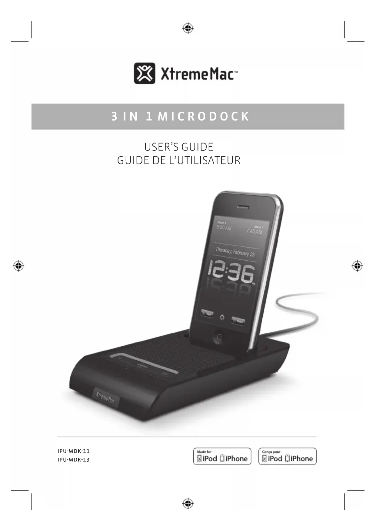 - Consult the dealer or an experienced radio/TV technician for help. This class B digital apparatus complies with Canadian ICES-003. Félicitations ! Et merci d’avoir acheté un Microdock 3 en 1, le dock audio de chargement pour iPod ou iPhone. Les pages qui suivent vous présentent les caractéristiques et le fonctionnement du Microdock 3 en 1. Nous vous invitons à prendre quelques instants pour les parcourir. Pour un réveil personnalisé et une intégration complète avec ce produit, téléchargez l’application de réveil gratuite XtremeMac sur l’App Store iTunes. Remarque : cette application ne fonctionne que sur les modèles iPhone et iPod touch. CONTENu DE la BOîTE: