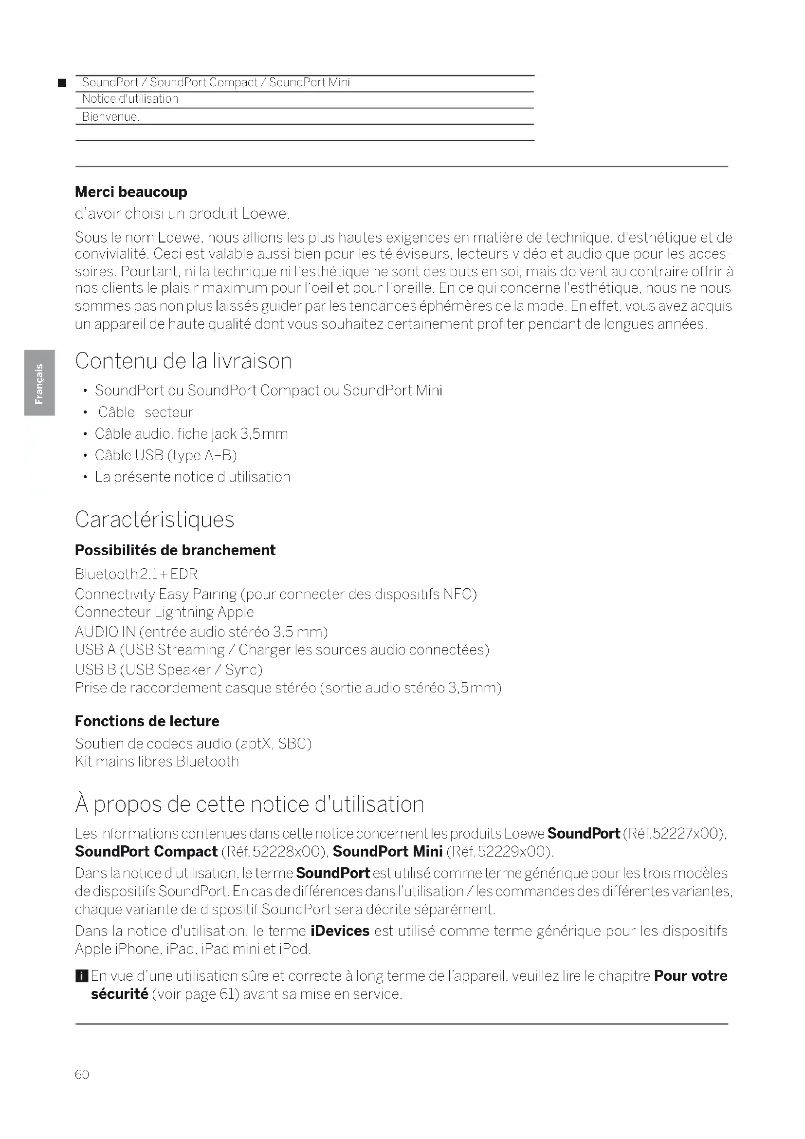 - La présente notice d'utilisation Caractéristiques Possibilités de branchement Bluetooth2.1+EDR Connectivity Easy Pairing (pour connecter des dispositifs NFC) Connecteur Lightning Apple AUDIO IN (entrée audio stéréo 3,5 mm) USB A (USB Streaming / Charger les sources audio connectées) USB B (USB Speaker / Sync) Prise de raccordement casque stéréo (sortie audio stéréo 3,5mm) Fonctions de lecture Soutien de codecs audio (aptX, SBC) Kit mains libres Bluetooth À propos de cette notice d'utilisation Les informations contenues dans cette notice concernent les produits Loewe SoundPort (Réf.52227x00), SoundPort Compact (Réf.52228x00), SoundPort Mini (Réf.52229x00). Dans la notice d'utilisation, le terme SoundPort est utilisé comme terme générique pour les trois modèles de dispositifs SoundPort. En cas de différences dans l'utilisation / les commandes des différentes variantes, chaque variante de dispositif SoundPort sera décrite séparément. Dans la notice d'utilisation, le terme iDevices est utilisé comme terme générique pour les dispositifs Apple iPhone, iPad, iPad mini et iPod. En vue d’une utilisation sûre et correcte à long terme de l’appareil, veuillez lire le chapitre Pour votre sécurité (voir page 61) avant sa mise en service.SoundPort / SoundPort Compact / SoundPort Mini Notice d'utilisation Français