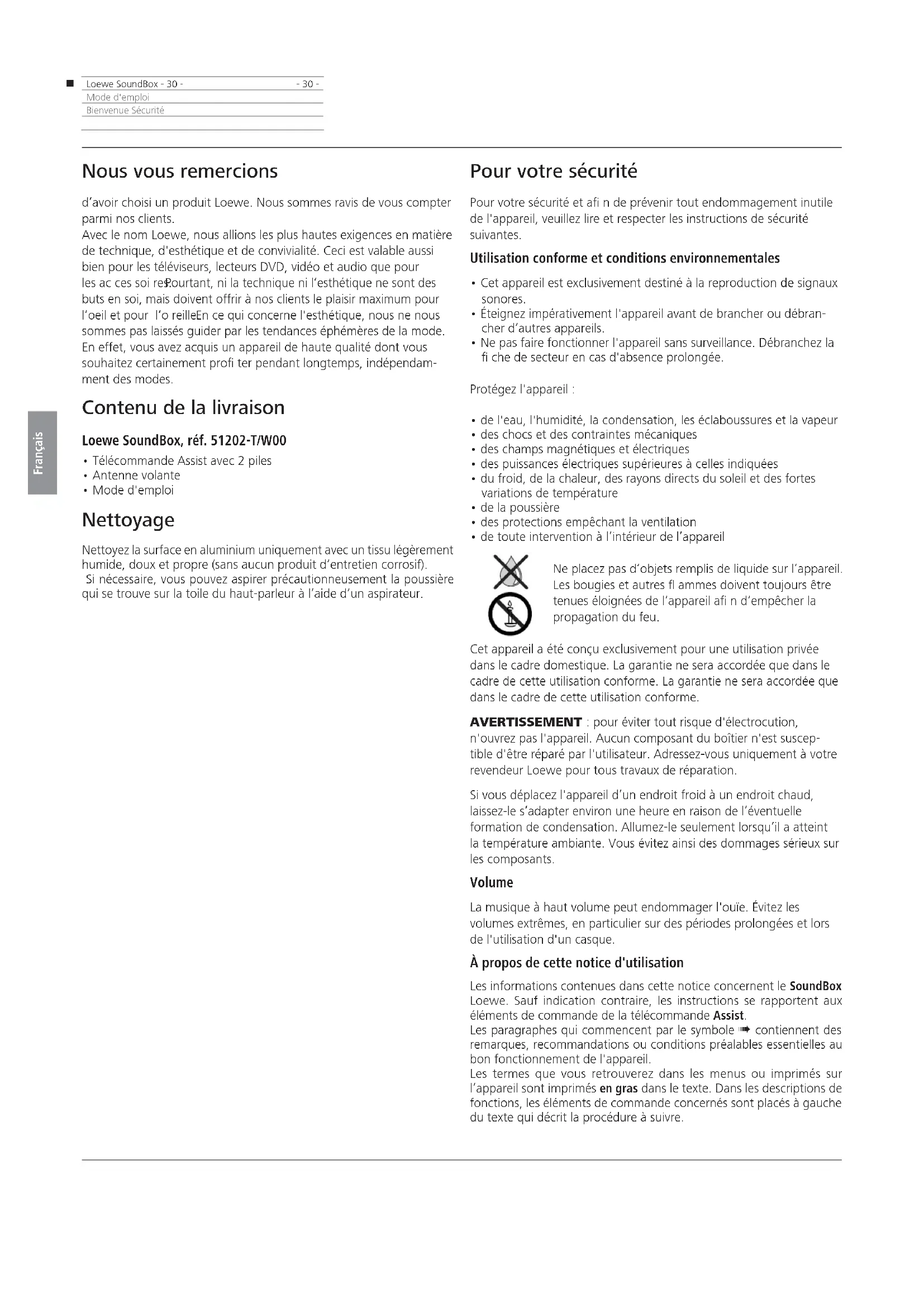 - 30 -Mode d'emploiBienvenue Sécurité Nous vous remercions d’avoir choisi un produit Loewe. Nous sommes ravis de vous compter parmi nos clients. Avec le nom Loewe, nous allions les plus hautes exigences en matière de technique, d'esthétique et de convivialité. Ceci est valable aussi bien pour les téléviseurs, lecteurs DVD, vidéo et audio que pour les ac ces soi res. Pourtant, ni la technique ni l‘esthétique ne sont des buts en soi, mais doivent offrir à nos clients le plaisir maximum pour l‘oeil et pour l‘o reille. En ce qui concerne l'esthétique, nous ne nous sommes pas laissés guider par les tendances éphémères de la mode. En effet, vous avez acquis un appareil de haute qualité dont vous souhaitez certainement proÆ ter pendant longtemps, indépendam- ment des modes. Contenu de la livraison Loewe SoundBox, réf. 51202-T/W00