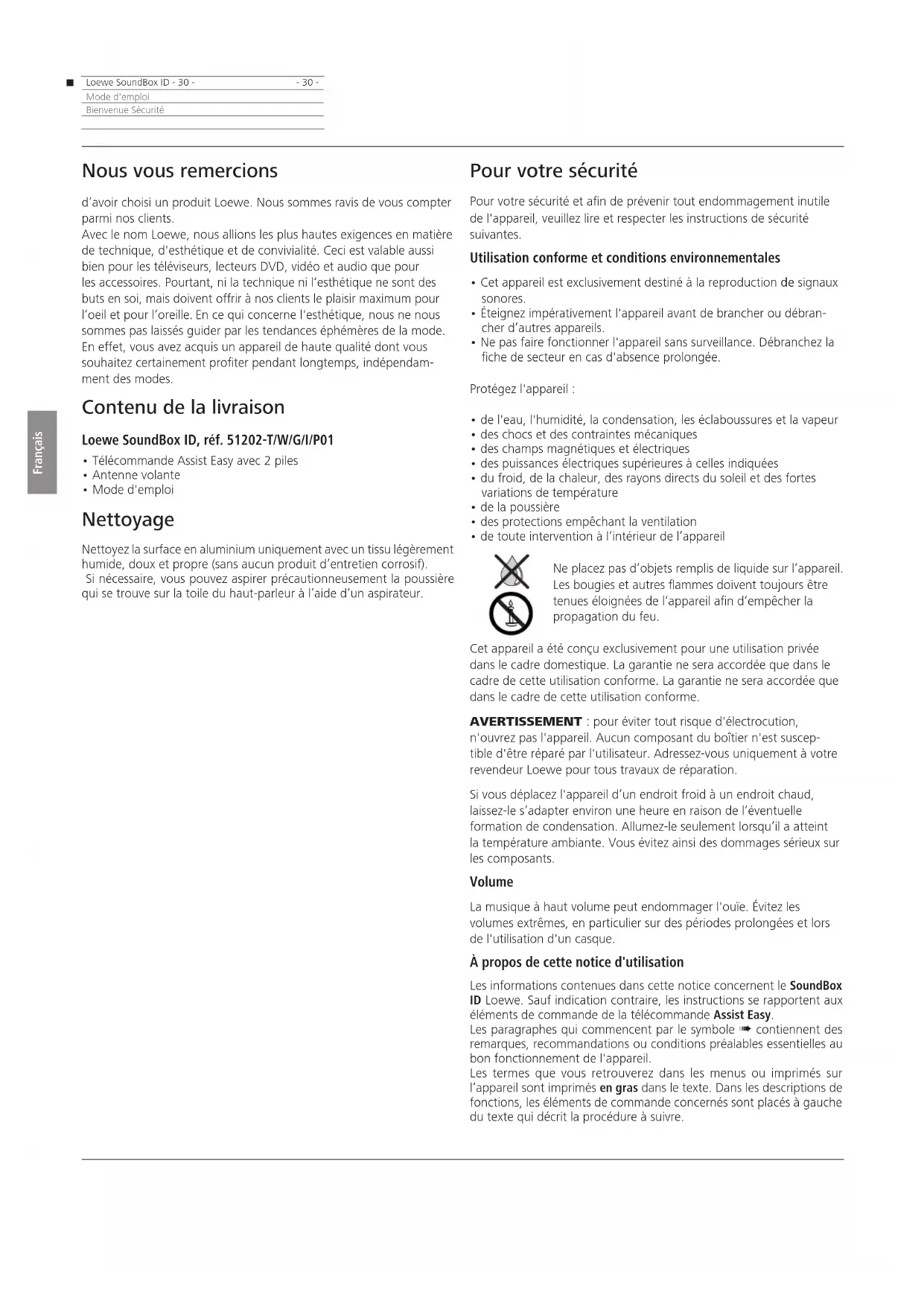 - 30 -Mode d'emploiBienvenue Sécurité Nous vous remercions d’avoir choisi un produit Loewe. Nous sommes ravis de vous compter parmi nos clients. Avec le nom Loewe, nous allions les plus hautes exigences en matière de technique, d'esthétique et de convivialité. Ceci est valable aussi bien pour les téléviseurs, lecteurs DVD, vidéo et audio que pour les accessoires. Pourtant, ni la technique ni l‘esthétique ne sont des buts en soi, mais doivent offrir à nos clients le plaisir maximum pour l‘oeil et pour l‘oreille. En ce qui concerne l'esthétique, nous ne nous sommes pas laissés guider par les tendances éphémères de la mode. En effet, vous avez acquis un appareil de haute qualité dont vous souhaitez certainement proter pendant longtemps, indépendam- ment des modes. Contenu de la livraison Loewe SoundBox ID, réf. 51202-T/W/G/I/P01