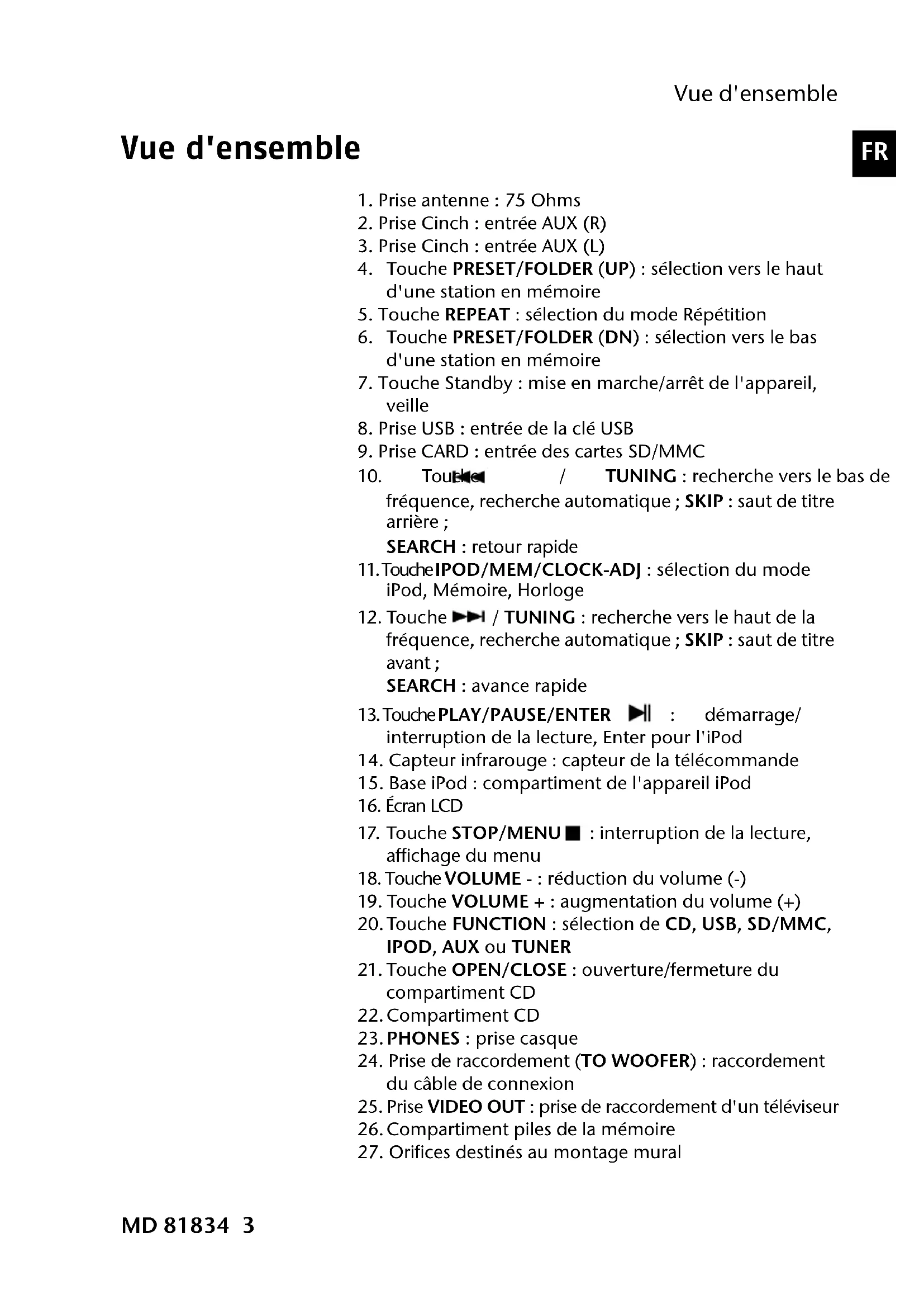 9. Touche FUNCTION : sélection de CD, USB, SD/MMC, IPOD, AUX ou TUNER
