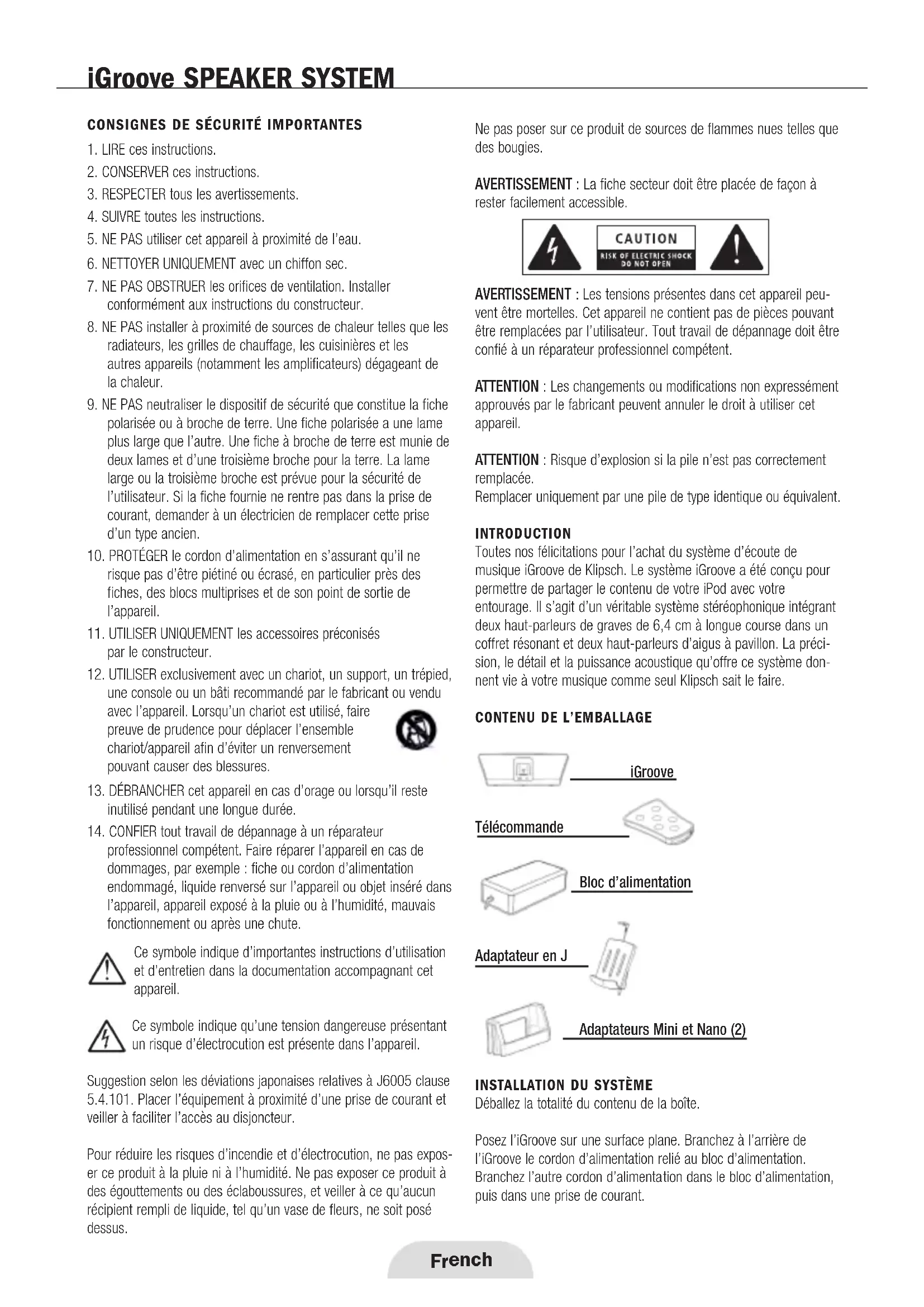 vent être mortelles. Cet appareil ne contient pas de pièces pouvant être remplacées par l’utilisateur. Tout travail de dépannage doit être confié à un réparateur professionnel compétent. ATTENTION : Les changements ou modifications non expressément approuvés par le fabricant peuvent annuler le droit à utiliser cet appareil. ATTENTION : Risque d’explosion si la pile n’est pas correctement remplacée. Remplacer uniquement par une pile de type identique ou équivalent. INTRODUCTION Toutes nos félicitations pour l’achat du système d’écoute de musique iGroove de Klipsch. Le système iGroove a été conçu pour permettre de partager le contenu de votre iPod avec votre entourage. Il s’agit d’un véritable système stéréophonique intégrant deux haut-parleurs de graves de 6,4 cm à longue course dans un coffret résonant et deux haut-parleurs d’aigus à pavillon. La préci- sion, le détail et la puissance acoustique qu’offre ce système don- nent vie à votre musique comme seul Klipsch sait le faire.