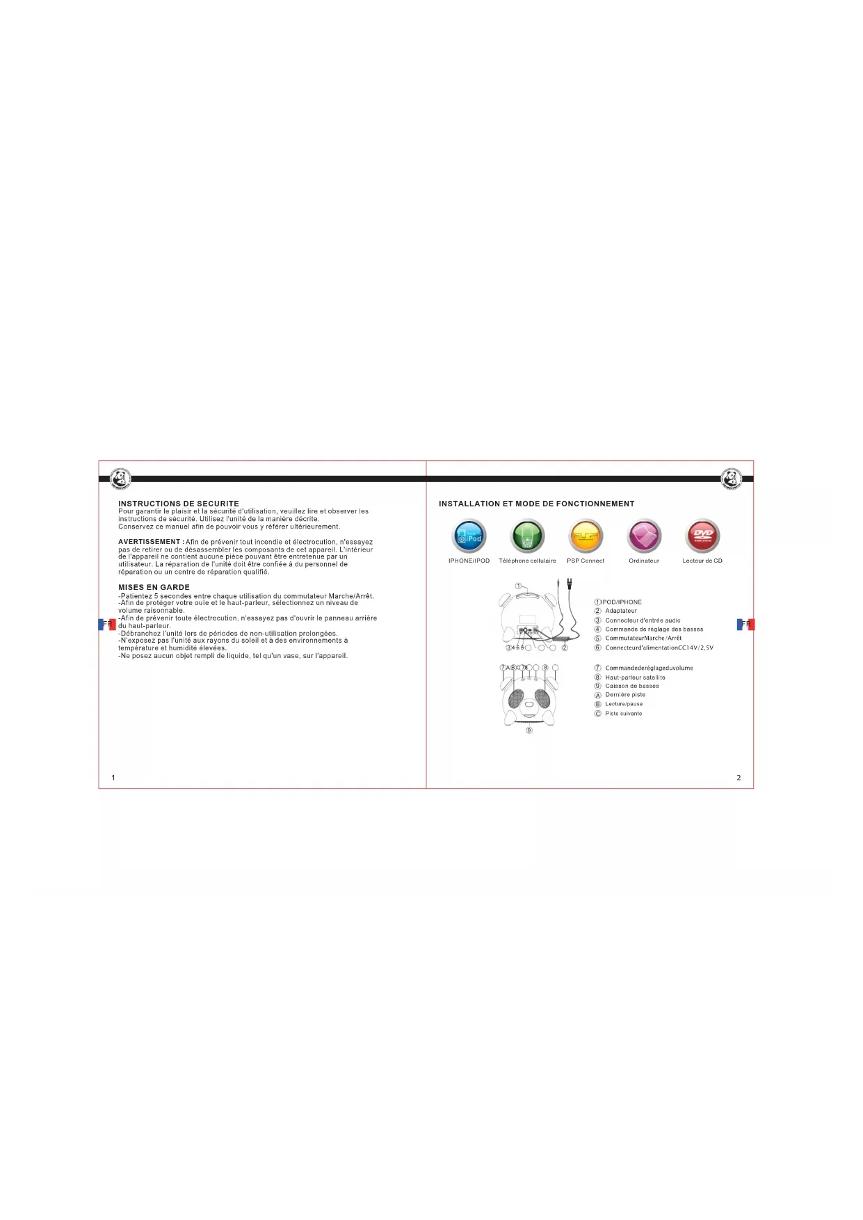 | 2) Lecture/Pause: La lecture du contente de l'IPOD/IPONE. En cours de lecture, appuyez (durée inférieure à 3 sec.) sur la touche « Lecture/Pause » pour intercomptre la lecture appuyez à nouveau sur cette touche pour reprogramme la lecture. Maintenée enforcé de la touche (durée supérieure à 3 sec.) « Lecture/Pause » pour arreter la lecture, le témoin d'alimentation clignote en rouge une fois toutes les deux secondes. Maintençé à nouveau enforcé cette touche pour reprogramme la lecture. | |
