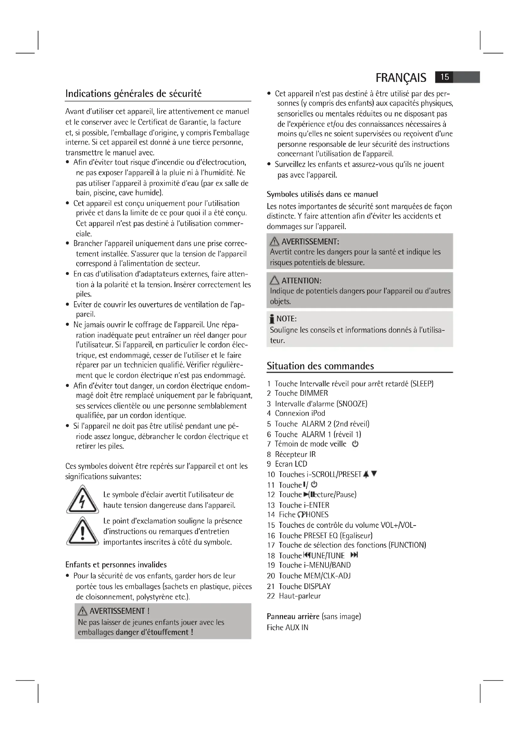 Avertit contre les dangers pour la santé et indique les risques potentiels de blessure. ATTENTION: Indique de potentiels dangers pour l’appareil ou d’autres objets. NOTE: Souligne les conseils et informations donnés à l’utilisa- teur. Situation des commandes 1 Touche Intervalle réveil pour arrêt retardé (SLEEP) 2 Touche DIMMER 3 Intervalle d‘alarme (SNOOZE) 4 Connexion iPod 5 Touche ALARM 2 (2nd réveil) 6 Touche ALARM 1 (réveil 1) 7 Témoin de mode veille 8 Récepteur IR 9 Ecran LCD 10 Touches i-SCROLL/PRESET / 11 Touche / 12 Touche (Lecture/Pause) 13 Touche i-ENTER 14 Fiche PHONES 15 Touches de contrôle du volume VOL+/VOL- 16 Touche PRESET EQ (Egaliseur) 17 Touche de sélection des fonctions (FUNCTION) 18 Touche TUNE/TUNE 19 Touche i-MENU/BAND 20 Touche MEM/CLK-ADJ 21 Touche DISPLAY 22 Haut-parleur Panneau arrière (sans image) Fiche AUX IN16 FRANÇAIS Télécommande 1 Touche de sélection des fonctions (FUNC) 2 Touche DISPLAY 3 Touche (Lecture/Pause) 4 Touche CLK-ADJ/MEM 5 Touche BAND/i-MENU 6 Touche i-REPEAT/ 7 Touche SNOOZE 8 Touche EQ 9 Touche de contrôle du volume VOLUME+/VOLUME- 10 Touche ALARM 1 11 Touche ALARM 2 12 Touche i-ENTER 13 Touches i-SCROLL/PRESET
