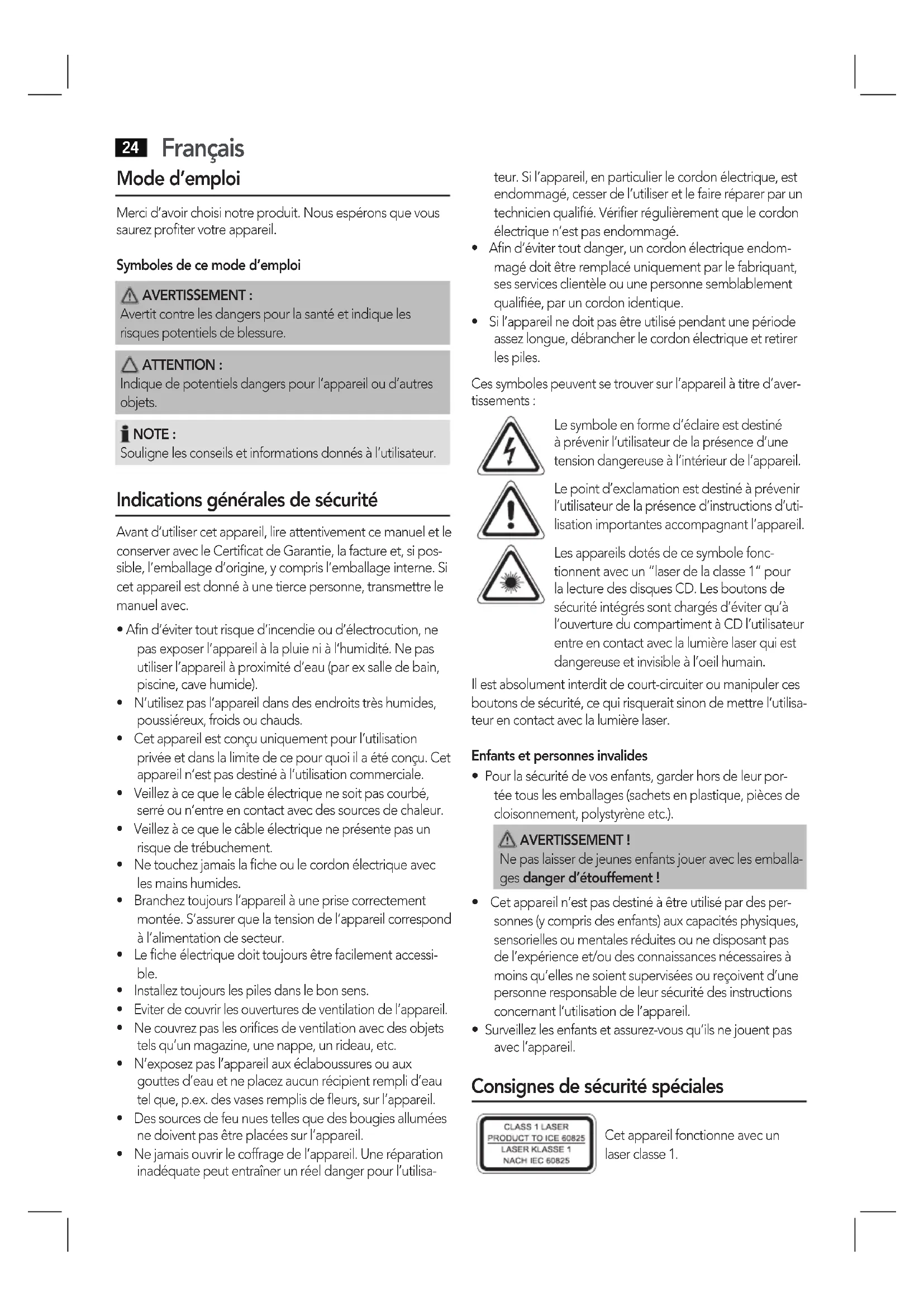 - Sil’appareilnedoitpasêtreutilisépendantunepériode assez longue, débrancher le cordon électrique et retirer les piles. Ces symboles peuvent se trouver sur l’appareil à titre d’aver- tissements : Le symbole en forme d’éclaire est destiné à prévenir l’utilisateur de la présence d’une tension dangereuse à l’intérieur de l’appareil. Le point d’exclamation est destiné à prévenir l’utilisateur de la présence d’instructions d’uti- lisation importantes accompagnant l’appareil. Les appareils dotés de ce symbole fonc- tionnent avec un “laser de la classe 1“ pour la lecture des disques CD. Les boutons de sécurité intégrés sont chargés d’éviter qu’à l’ouverture du compartiment à CD l’utilisateur entreencontactaveclalumièrelaserquiest dangereuse et invisible à l’oeil humain. Il est absolument interdit de court-circuiter ou manipuler ces boutons de sécurité, ce qui risquerait sinon de mettre l’utilisa- teurencontactaveclalumièrelaser. Enfants et personnes invalides