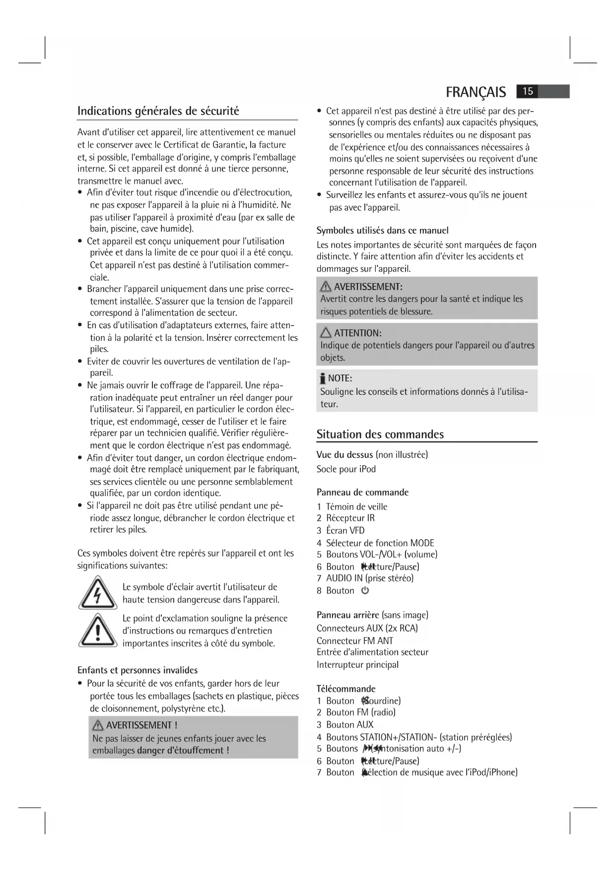 Description des commandes iPod /iPhone