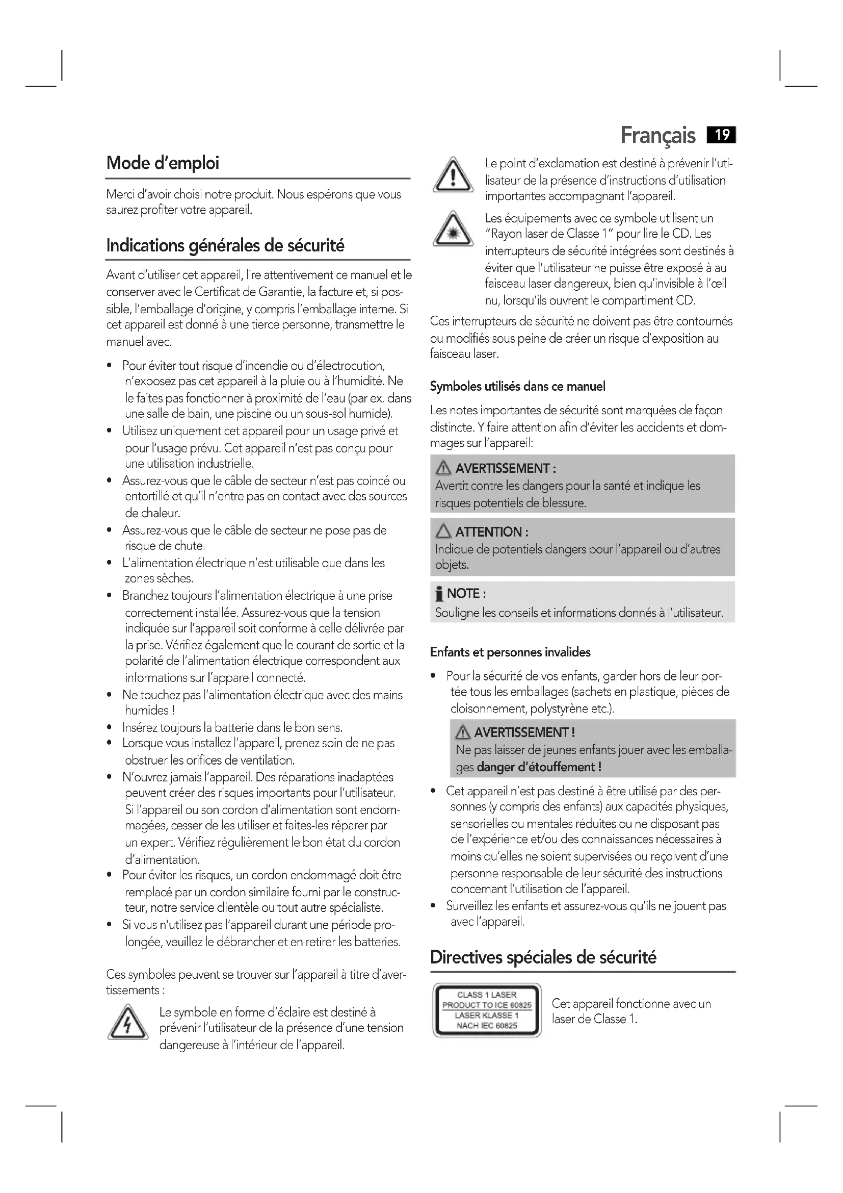 - Sivousn’utilisezpasl’appareildurantunepériodepro- longée, veuillez le débrancher et en retirer les batteries. Ces symboles peuvent se trouver sur l’appareil à titre d’aver- tissements : Le symbole en forme d’éclaire est destiné à prévenir l’utilisateur de la présence d’une tension dangereuse à l’intérieur de l’appareil. Lepointd’exclamationestdestinéàprévenirl’uti- lisateur de la présence d’instructions d’utilisation importantes accompagnant l’appareil. Les équipements avec ce symbole utilisent un “RayonlaserdeClasse1”pourlireleCD.Les interrupteurs de sécurité intégrées sont destinés à éviterquel’utilisateurnepuisseêtreexposéàau faisceaulaserdangereux,bienqu’invisibleàl’œil nu, lorsqu’ils ouvrent le compartiment CD. Cesinterrupteursdesécuriténedoiventpasêtrecontournés oumodiéssouspeinedecréerunrisqued’expositionau faisceau laser. Symboles utilisés dans ce manuel Les notes importantes de sécurité sont marquées de façon distincte.Yfaireattentionand’éviterlesaccidentsetdom- mages sur l’appareil: