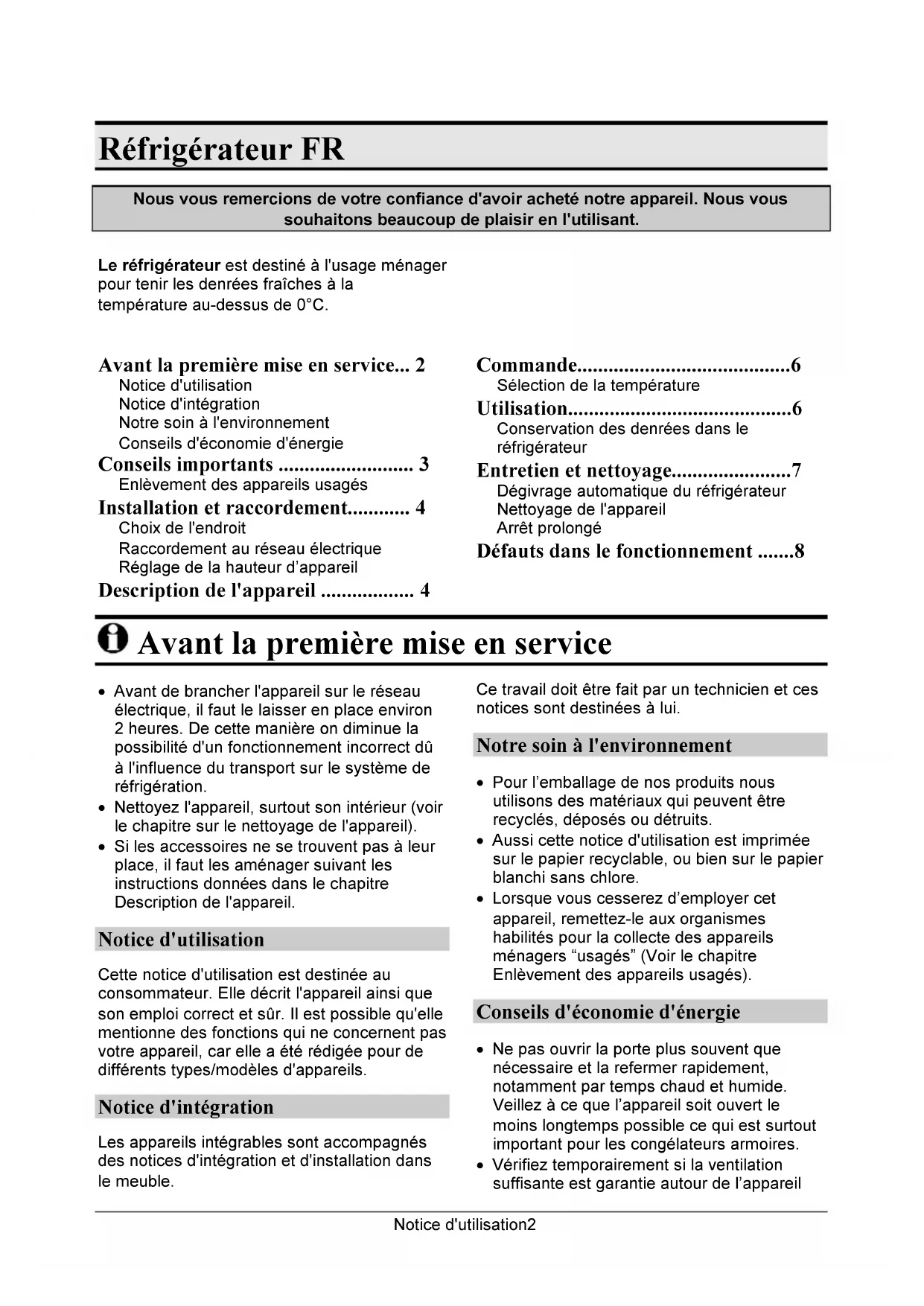 - Notice d'utilisation2 Réfrigérateur FR Nous vous remercions de votre confiance d'avoir acheté notre appareil. Nous vous souhaitons beaucoup de plaisir en l'utilisant. Le réfrigérateur est destiné à l'usage ménager pour tenir les denrées fraîches à la température au-dessus de 0°C. Avant la première mise en service p. 2