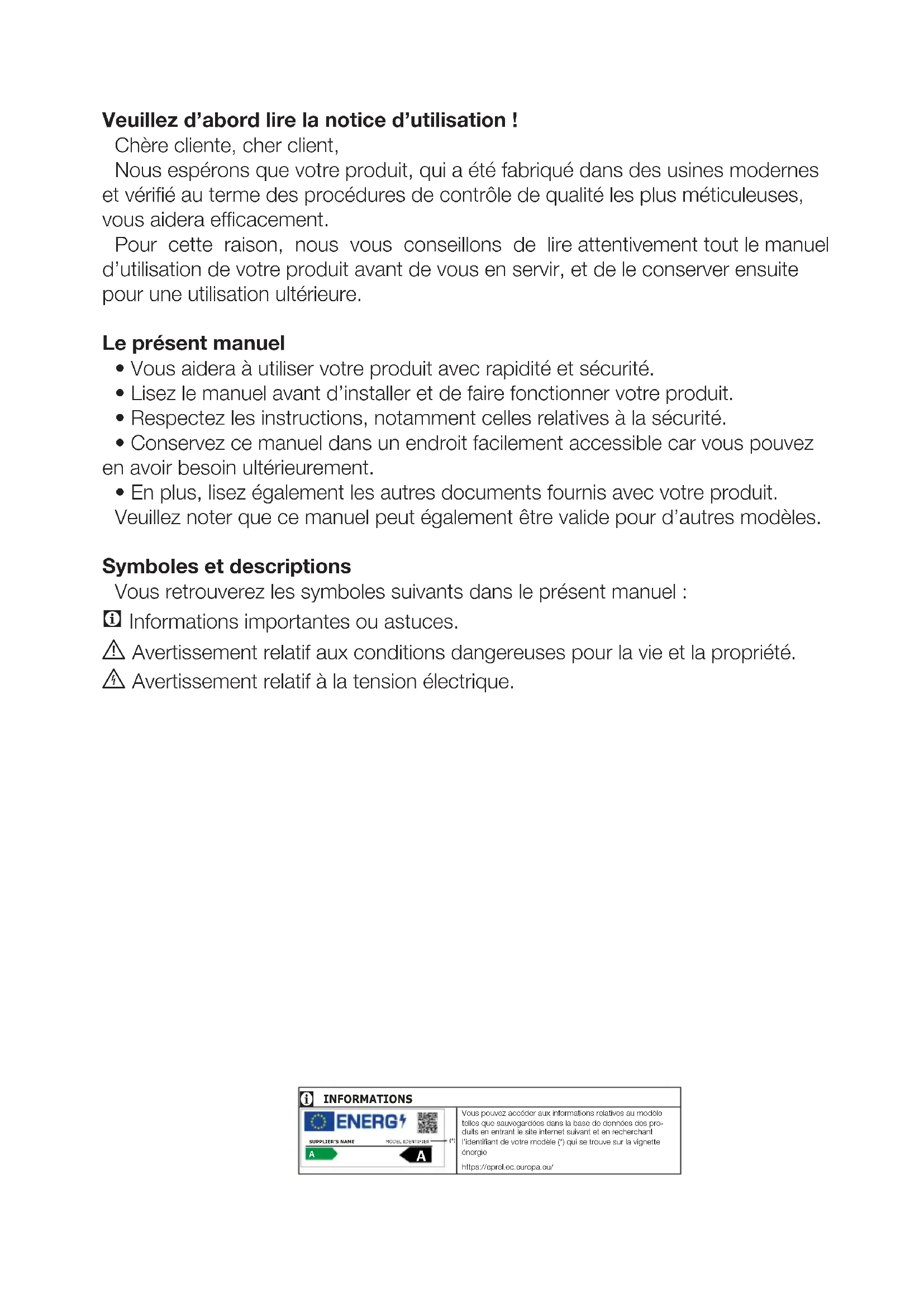 - Lisez le manuel avant d’installer et de faire fonctionner votre produit.